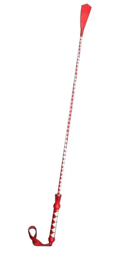 Этот стек длиной 85 см состоит из гибкой основы, овитой натуральной кожей красного и белого цветов, наконечника в виде хлопушки и петли для надевания на руку. Стек можно применять как для легких похлопываний, так и для более серьезных наказаний. Также он идеально подходит в качестве указки.