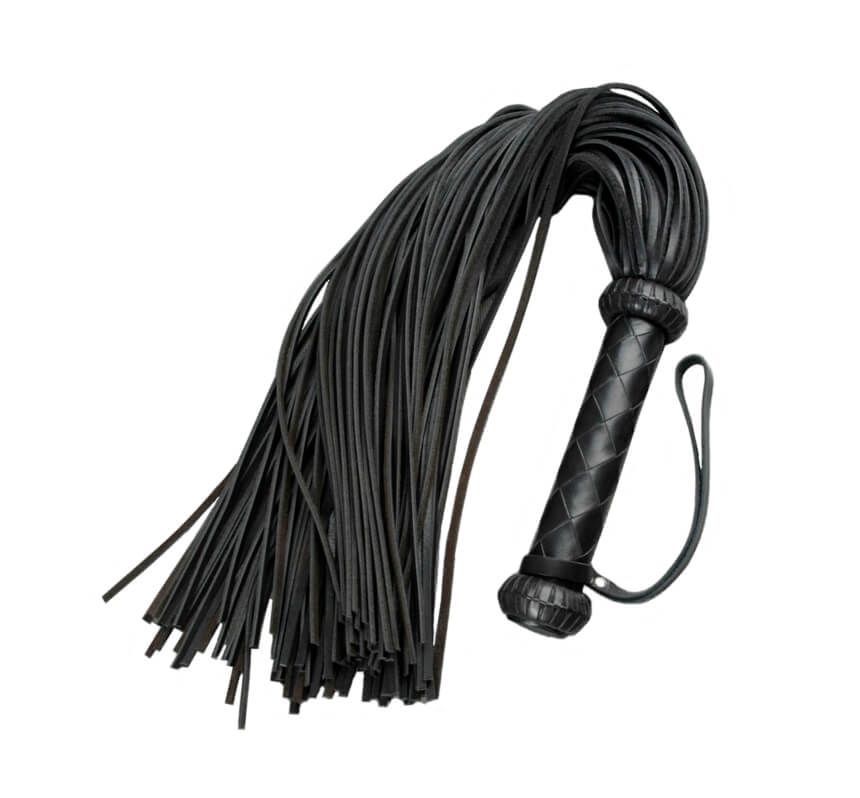 Плеть "Грешница" от бренда Beastly состоит из 90 прямоугольных полос и плетеной рукояти, украшенной ограничителями в виде "фонариков." Такой аксессуар позволит Вам со всей страстью наказать своего партнера и преподать ему пару уроков послушания. Плеть сделана из натуральной кожи черного цвета средней жесткости. На рукояти, плетенной 6 широкими полосами ромбом, есть петля для фиксации плети на запястье.