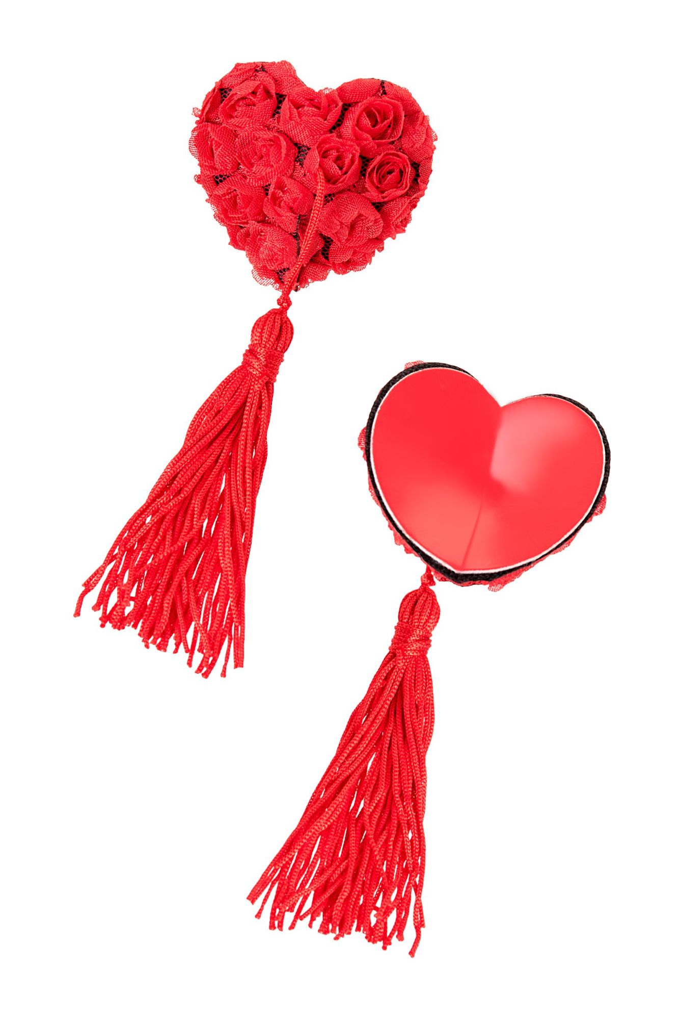 Наклейки на соски многоразовые. Однотонные. Конус выполнен из полиуретана, внутри — слой силиконового геля. Декор: тканевые розы и кисточки. Размер основания: 5 см. Длина кисти: 11 см. Наклеивать на чистую кожу без следов косметических средств. Снимать осторожно. После использования внутреннюю сторону промыть теплой водой. Хранить, изолировав клейкий слой пленкой или приклеив к стеклянной поверхности (зеркалу). Не использовать при гиперчувствительности к силикону, нарушениях пигментации или повреждениях кожи груди.