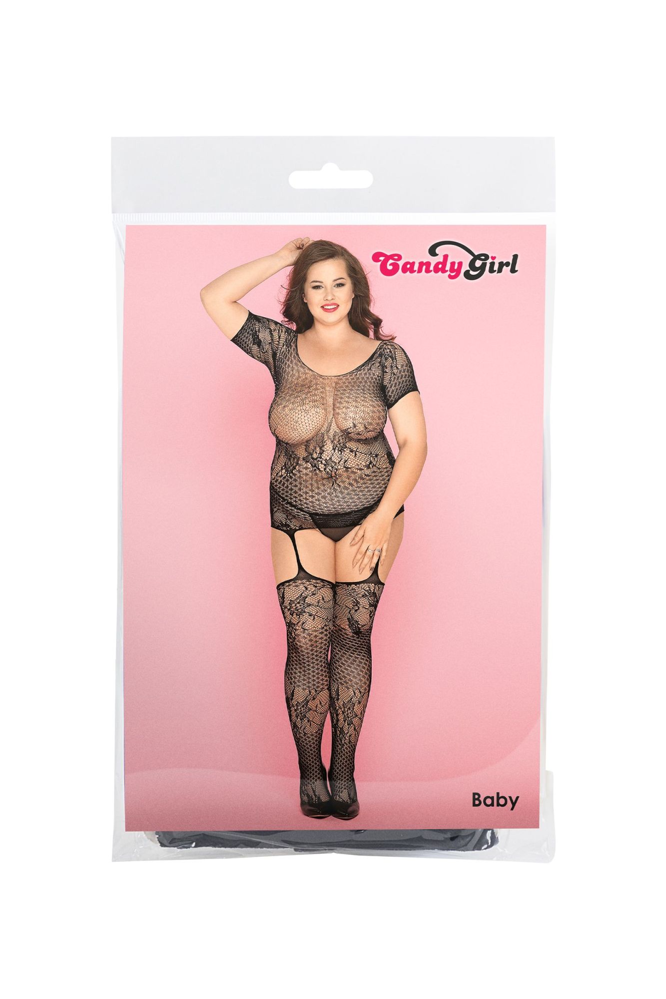 Эластичный бесшовный костюм-сетка из топа с короткими рукавами и чулок Baby от Candy Girl®. Сочетание ажурного и геометрического рисунков плетения притягивает взгляд. Стринги и усиленные мыски чулок обеспечивают комфорт при использовании.