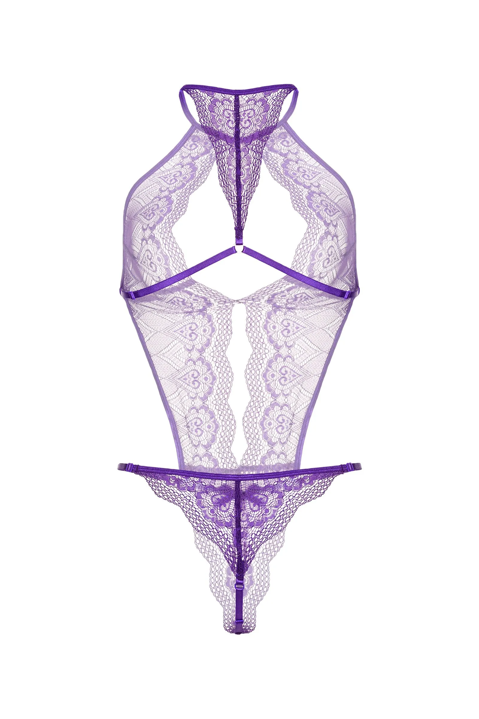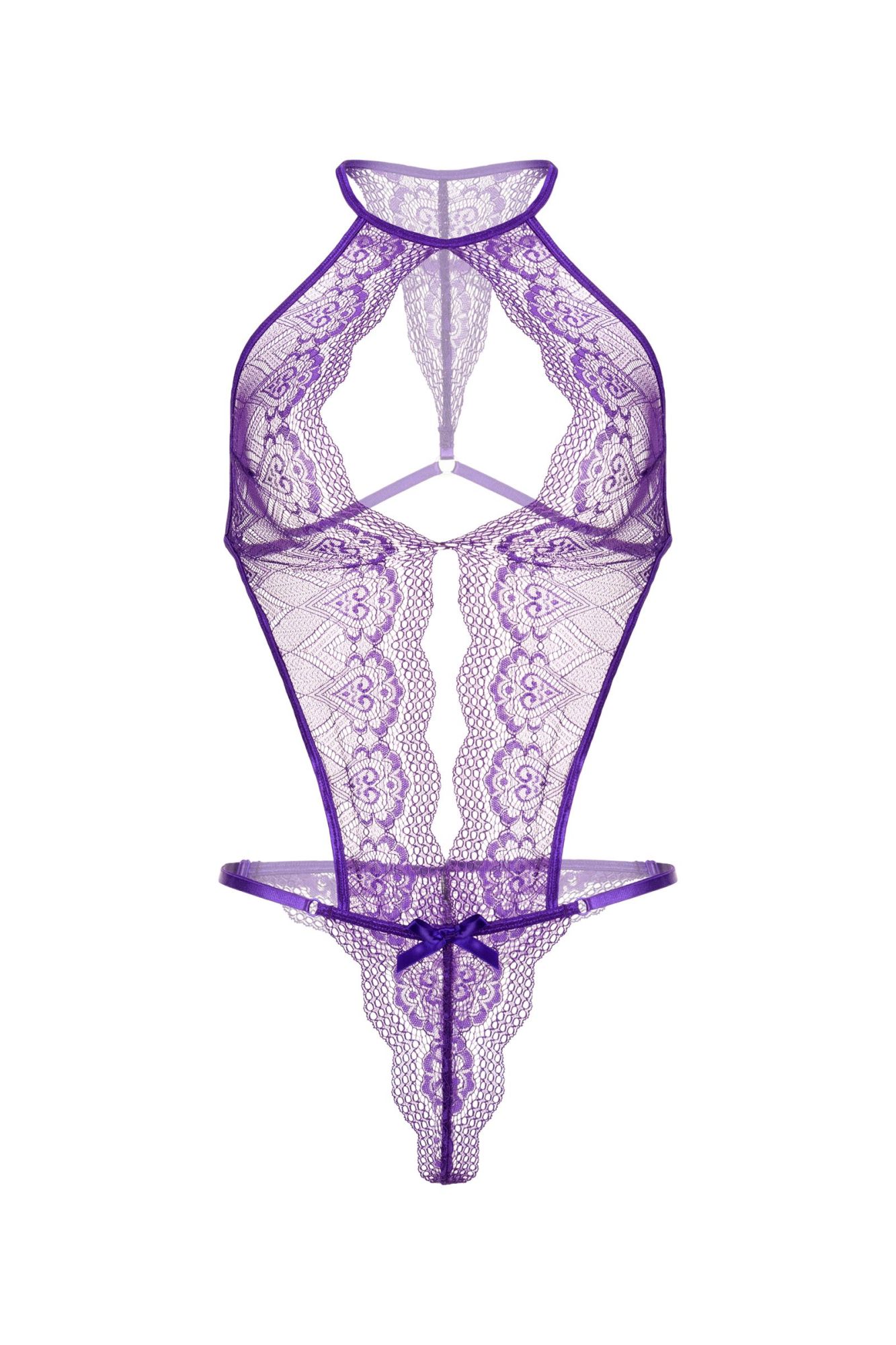 Кружевное боди с глубоким фигурным декольте, украшенным сатиновым бантиком. Застежка на шее, регулируемые перемычки на спинке, на бедрах, в интимной зоне.
