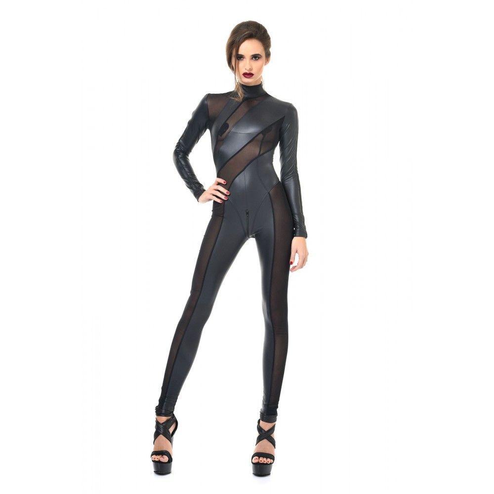 Комбинезон Zia от французского дизайнера Patrice Catanzaro выполнен из черного материала, напоминающего мокрую кожу, и вставок из мелкой сетки. Комбинезон будет идеально облегать тело, подчеркивая все достоинства Вашей фигуры и плавно очерчивая все ее соблазнительные изгибы. Наряд прикроет самые интимные места, однако благодаря прозрачной сетке, обнажающей участки тела, оставит огромный простор для фантазии. Застегивается он на молнию с двумя ползунками, которая провокационно проходит через промежность.
