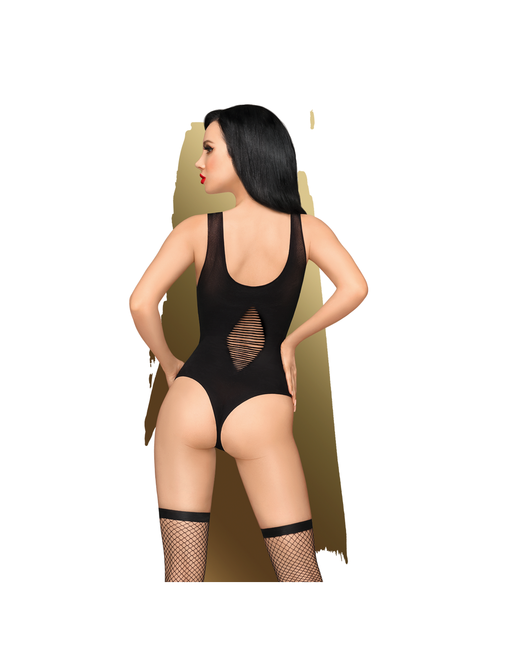 Откровенный боди выполнен в меткую сетку с вырезом в виде шнуровки.