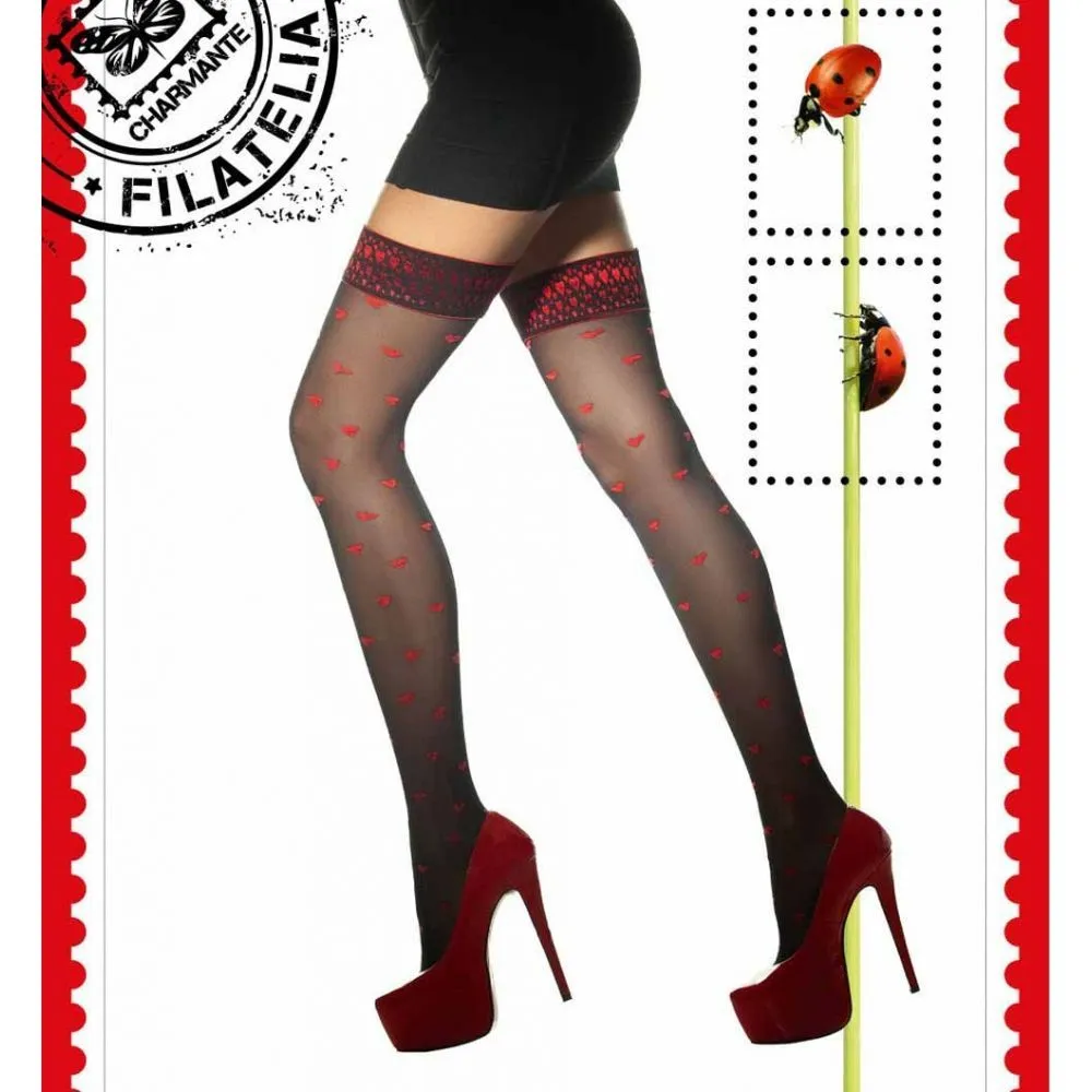Оригинальные чулки Charmante Ladybird на силиконовой резинке для комфортной носки без пояса с оригинальным рисунком в виде красных сердец. Чулки идеально подчеркивают длину и стройность ног.