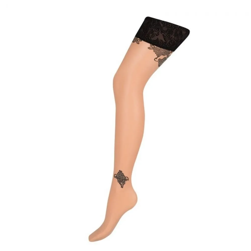 Великолепные чулки Charmante Pigmenti на контрастной силиконовой поддержке. Цветочный орнамент c эффектом тату идеально подчёркивает изысканный вкус владелицы.