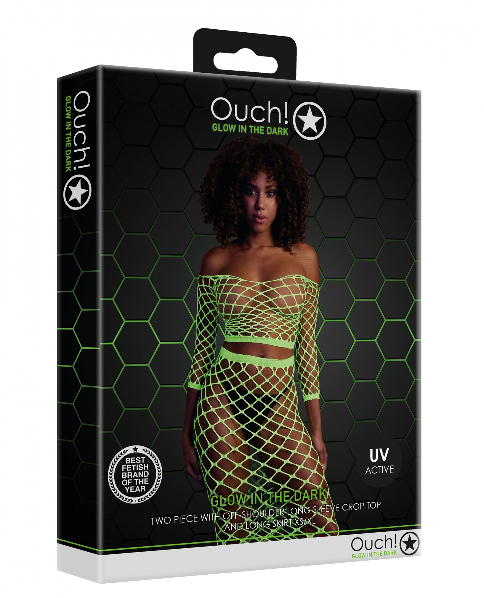 Шикарный неоновый комплект из юбки и топа в широкую сетку. Изделия изготовлены из плотной сетки и декорированы красивым сексуальным узором притягивающим взгляд. Такое белье скрывает недостатки, подчеркивает достоинства фигуры и будет шикарно смотреться как с публичным нарядом, так и в спальне.