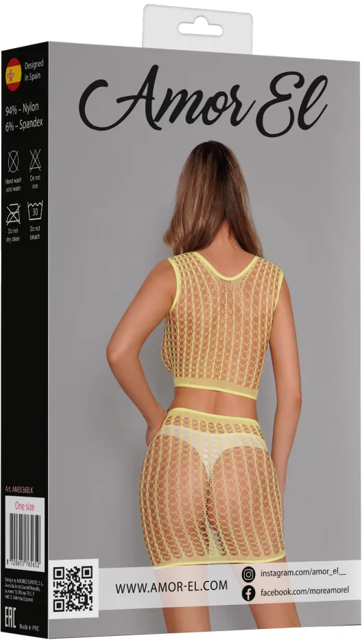 Комплект яркого и соблазнительного сетчатого белья, состоящего из полупрозрачного топа и короткой юбки.