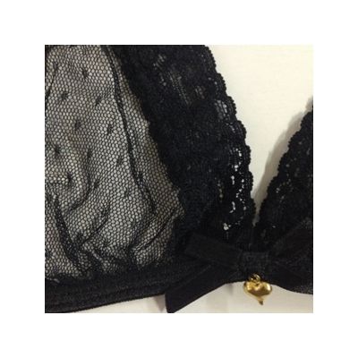 Комплект белья от компании Opium выполнен из тонкого полупрозрачного материала в мелкий горошек. Трусики завязываются по бокам на широкие атласные ленты. Лиф украшает маленькое сердечко золотистого цвета, которое придаст пикантности комплекту.