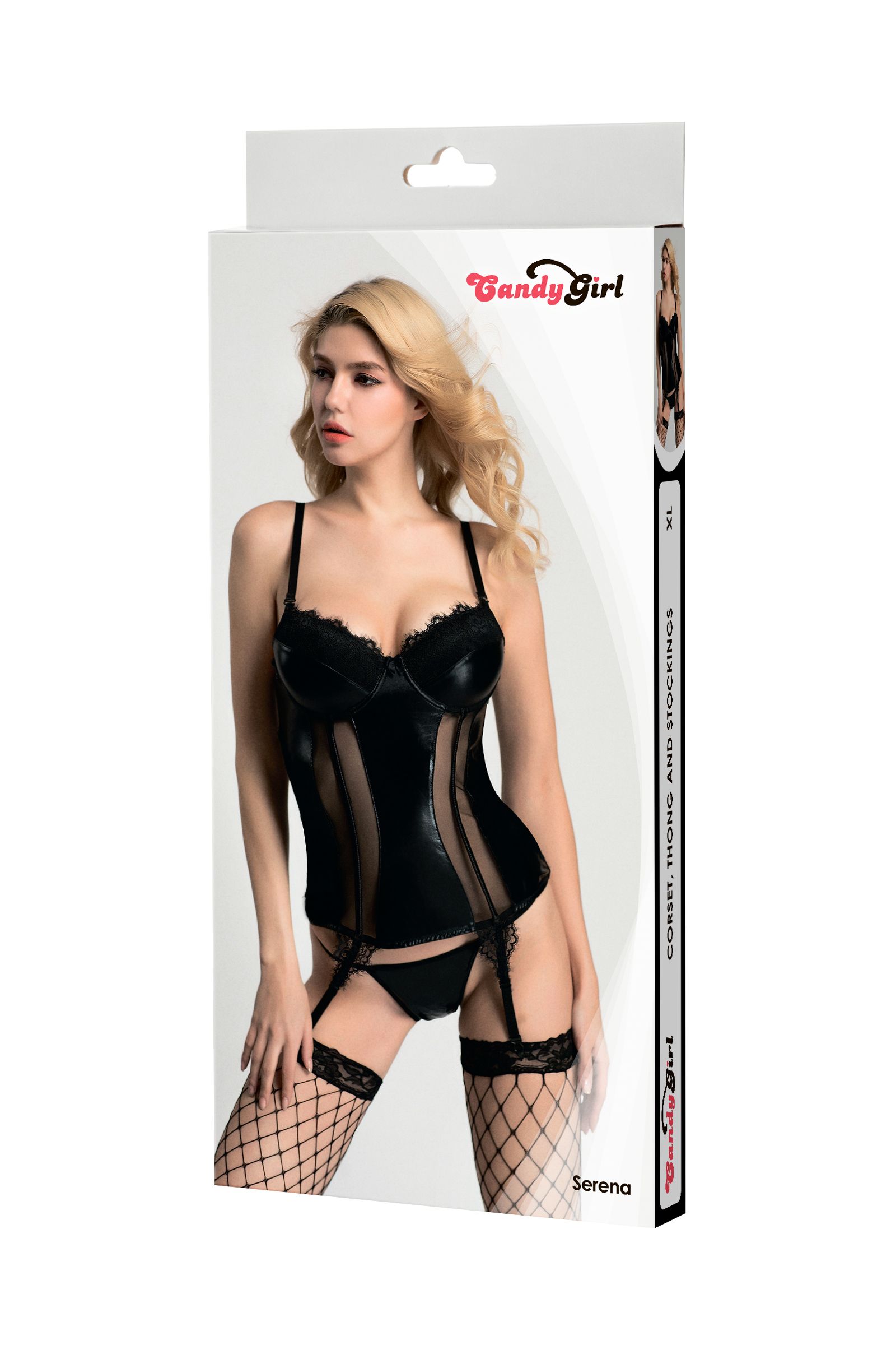 Корсет с плотными чашками Candy Girl® Serena визуально увеличит объем груди и добавит стройности силуэту благодаря продольным косточкам и регулируемым пажам. Сочетание эластичной сетки, ткани wetlook и кружева порадует любительниц интересных фактур. Регулируемые съемные бретели и многорядная застежка на спине обеспечат идеальную посадку. Стринги и чулки из крупной сетки с уплотненными мысками идеально дополнят образ.