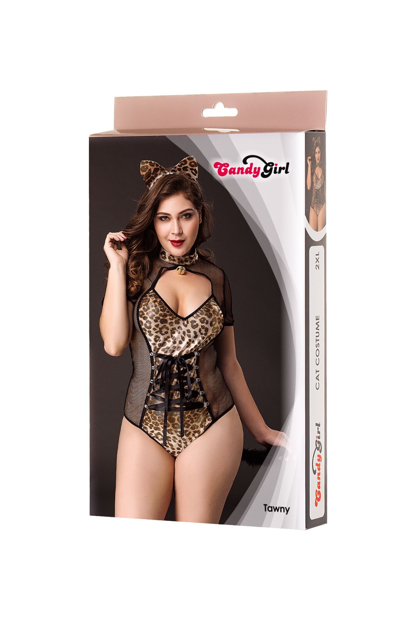 Костюм хищной кошки Candy Girl® Tawny из боди с воротником-стойкой, золотистым бубенчиком, глубоким декольте, короткими рукавами и меховым хвостом создает нужное настроение для ролевой игры. Шнуровка на талии позволяет регулировать облегание. Вставки блестящего эластичного трикотажа визуально формируют приталенный силуэт. Сетка по бокам дает полный обзор вдоль тела. Ушки-ободок в комплекте.