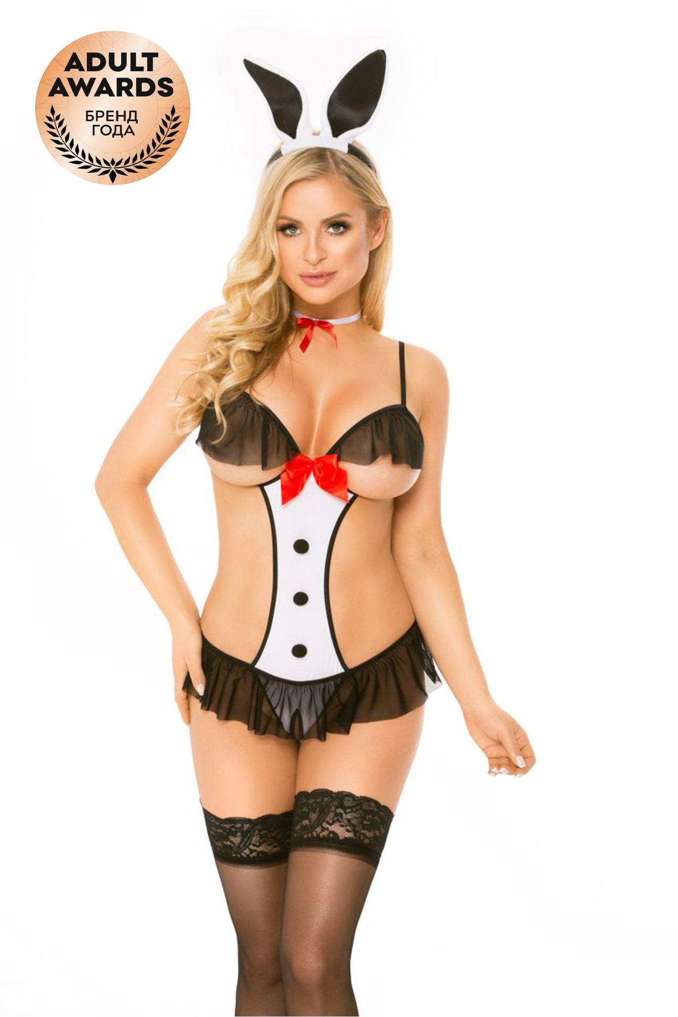 Роскошный костюм зайчика: изящное боди с юбочкой, повязка на шею, головной убор.