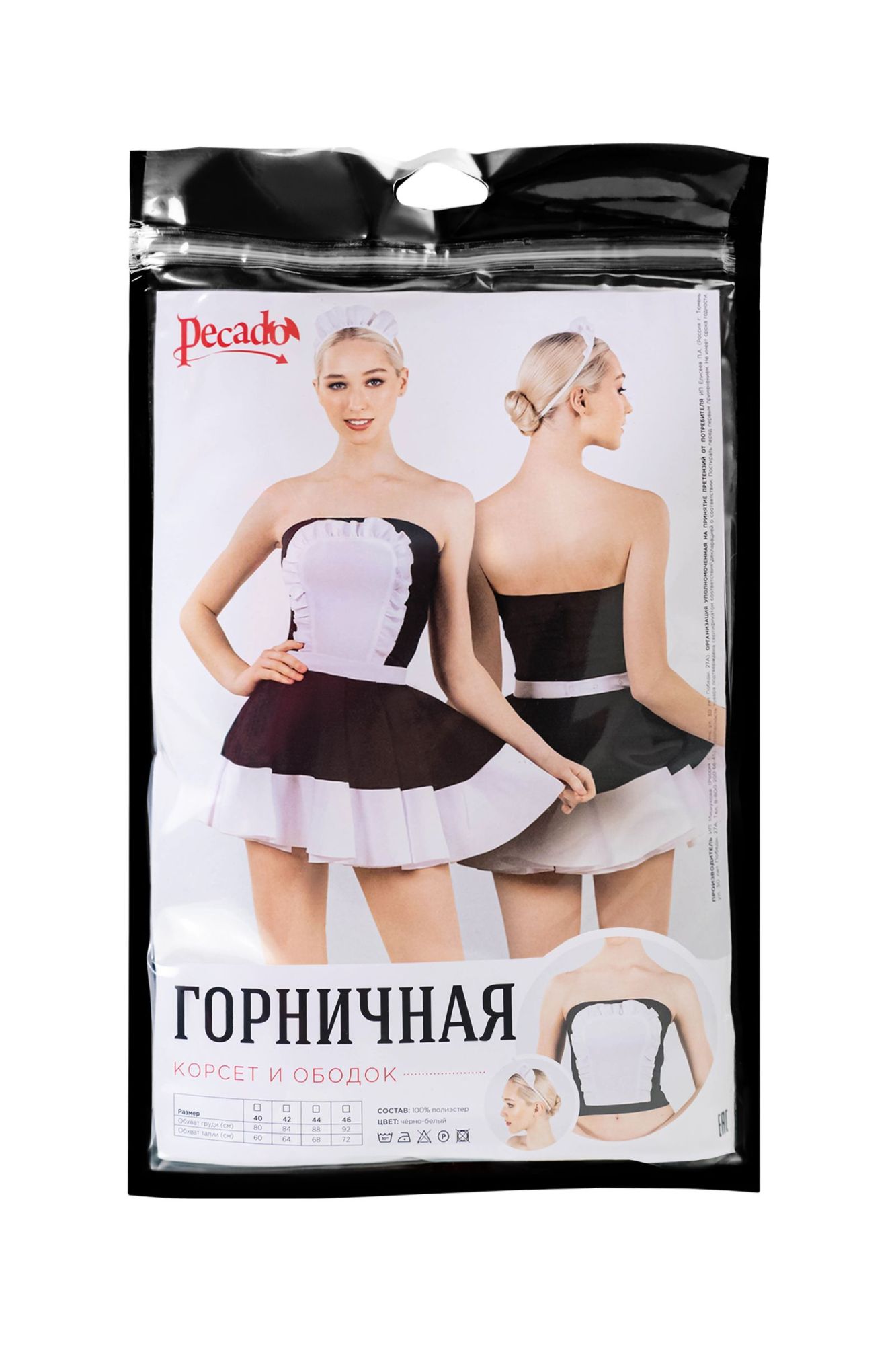 Нижняя и верхняя часть комплекта приобретаются отдельно. Именно так, Вы сможете подобрать для себя оптимальный размер. Мечтаете быть кокетливой горничной в ролевых играх? Осуществляйте самые яркие фантазии с эротическим костюмом от Pecado. Верхняя часть комплекта выполнена из черно-белого корсета. Материал качественный, прочный, нежный. Корсет изящно подчеркивает силуэт тела и красоту женской груди. Он удобно надевается с помощью надежной молнии сзади, хорошо фиксируется, и очень быстро снимается. Возбуждающий образ дополняет стильный ободок. Отдайтесь всем порывам чувств. Вместе с Pecado. ● Состав комплекта – корсет, ободок. ● Материал –100% полиэстер. ● Качественная фурнитура. ● Цвет – черный, белый. ● Сделано в России. ● Размерный ряд 40, 42, 44, 46 (Соответствует Российской размерной сетке).