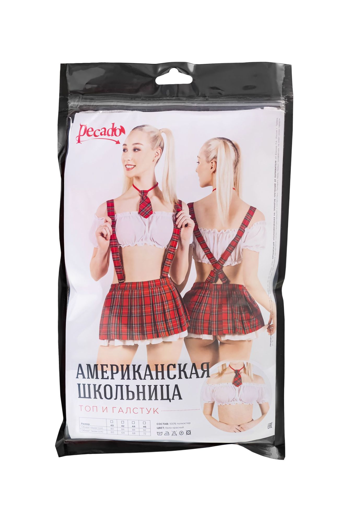 Нижняя и верхняя часть комплекта приобретаются отдельно. Именно так, Вы сможете подобрать оптимальный размер. Стать настоящей обольстительницей в ролевых играх поможет эротический костюм Американской школьницы от Pecado. Верхняя часть игрового комплекта состоит из полупрозрачного, белого топа с рукавами. Материал нежный и легкий как дуновение летнего ветерка. Благодаря удобным резинкам на рукавах, топ можно носить по-разному: закрыв плечи или игриво обнажив их. Мини-топ прелестно садится на разные типы фигуры и подчеркивает грудь. Благодаря качественной ткани он не теряет форму и не растягивается. Озорной галстук на застежках идеально дополняет сексуальный образ. Кто Вы: школьницы-отличница или заядлая прогульщица, решать только Вам! ● Состав комплекта – топ, галстук. ● Материал – 100% полиэстер. ● Качественная фурнитура. ● Цвет – белый, красный в клетку. ● Сделано в России. ● Размерный ряд 40, 42, 44, 46 (Соответствует Российской размерной сетке).