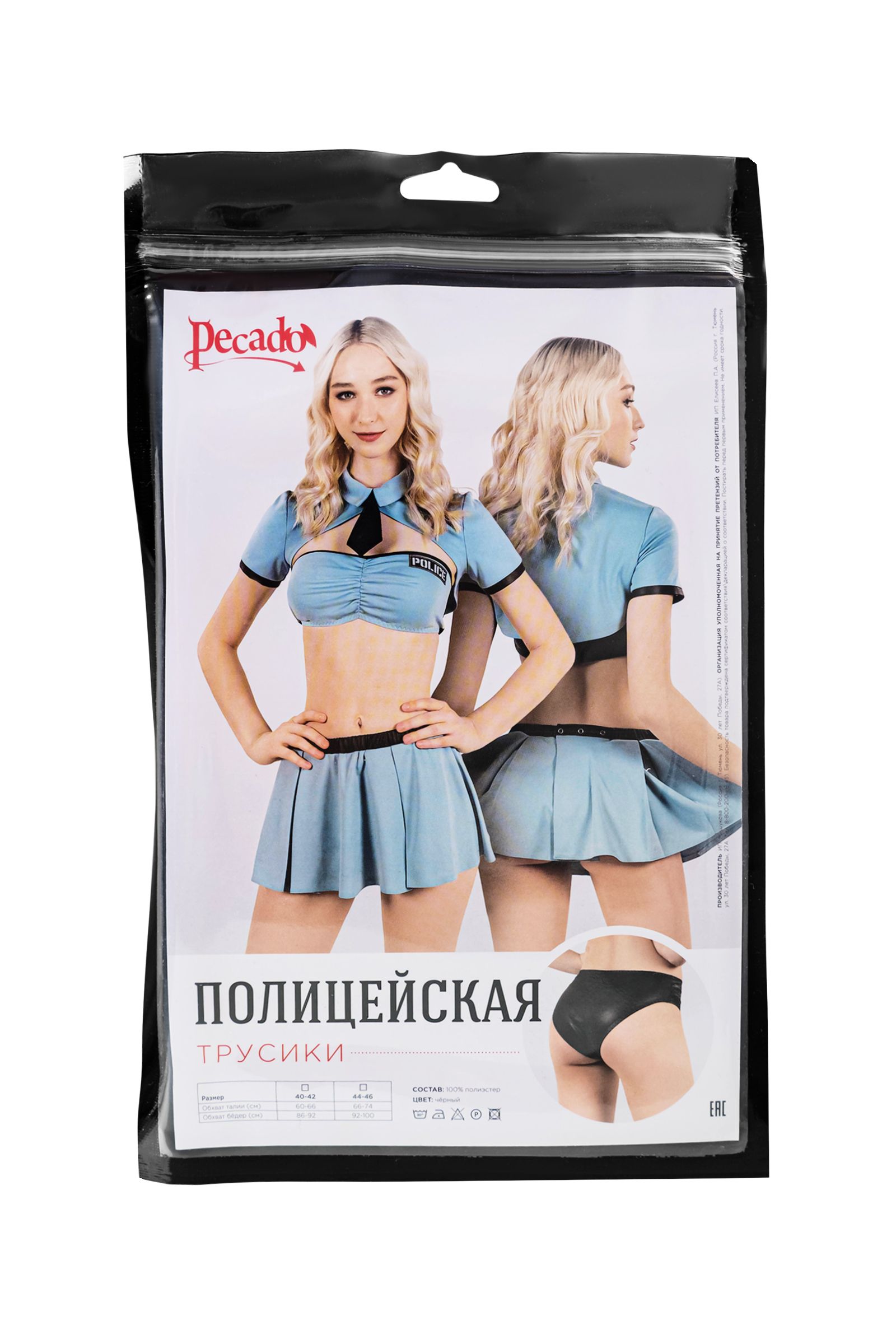 Нижняя и верхняя часть комплекта приобретаются отдельно. Именно так, Вы сможете подобрать оптимальный размер. Изящные трусики полицейской от Pecado подходят не только к этому костюму. Материал деталей лёгкий, плотный, не сковывающий движения. Легкая текстура ткани создает игривый настрой и приятна телу. Этот аксессуар для самых смелых и искушенных любителей ролевых игр. ● Состав комплекта – трусики. ● Материал трусиков: бифлекс под кожу – 85% полиэстер, 15% эластан. ● Качественная фурнитура. ● Цвет трусиков - чёрный. ● Сделано в России. ● Размерный ряд 40-42, 44-46 (Соответствует Российской размерной сетке).