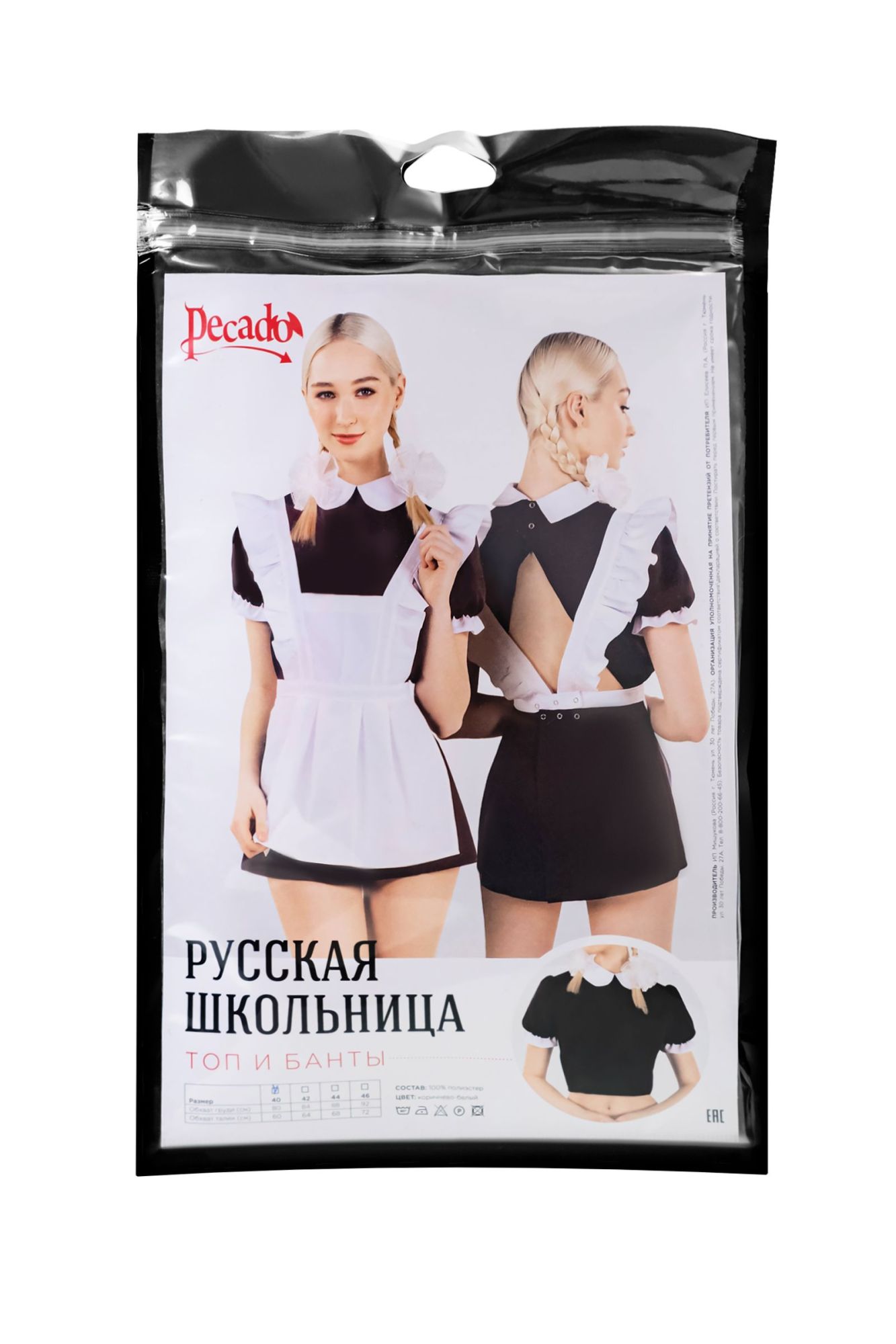 Эротический костюм русской школьницы от Pecado создан для Ваших самых чувственных ролевых игр! Темный топ, из которого выполнена верхняя часть комплекта, состоит из полиэстера. Материал нежный, приятный, износостойкий. Топ легко и быстро надевается, фиксируется с помощью застежек сзади. Также, благодаря металлической фурнитуре, соединяется с нижней часть костюма. Кокетливый вырез на спине открывает притягательный обзор и возбуждающий полёт фантазий. Быть школьницей, готовой к любым сексуальным урокам легко! Вместе с эротическим костюмом от Pecado. Нижняя и верхняя часть комплекта приобретаются отдельно. Именно так, Вы сможете подобрать оптимальный размер. ● Состав комплекта – топ, банты. ● Материал – 100% полиэстер. ● Качественная фурнитура. ● Цвет топа - коричневый, цвет бантов - белый . ● Сделано в России. ● Размерный ряд 40, 42, 44, 46 (Соответствует Российской размерной сетке).