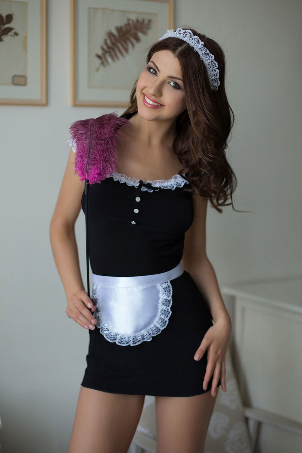 Костюм горничной состоит из непрозрачного короткого платья с открытой спиной, белого передника и головного убора.