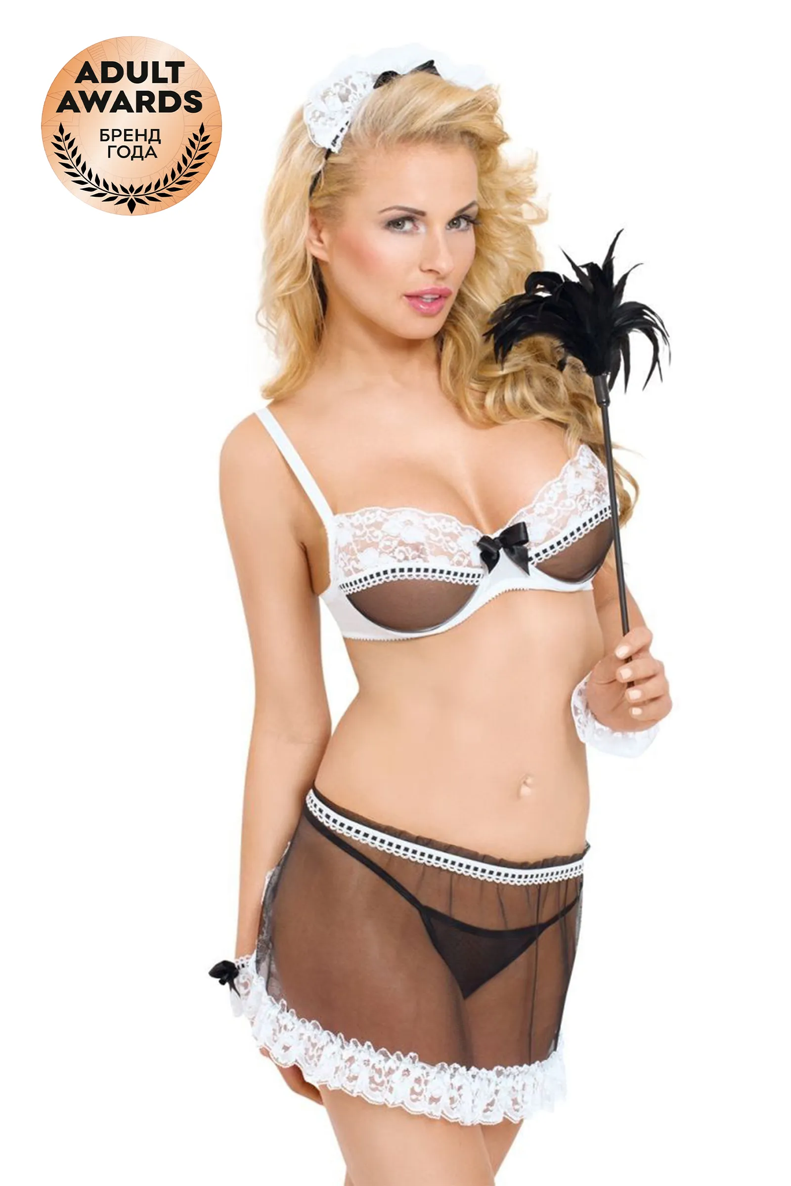 Роскошный комплект официантки: бюстгальтер с косточками, юбочка, головной убор и манжеты. Стринги в комплект не входят.