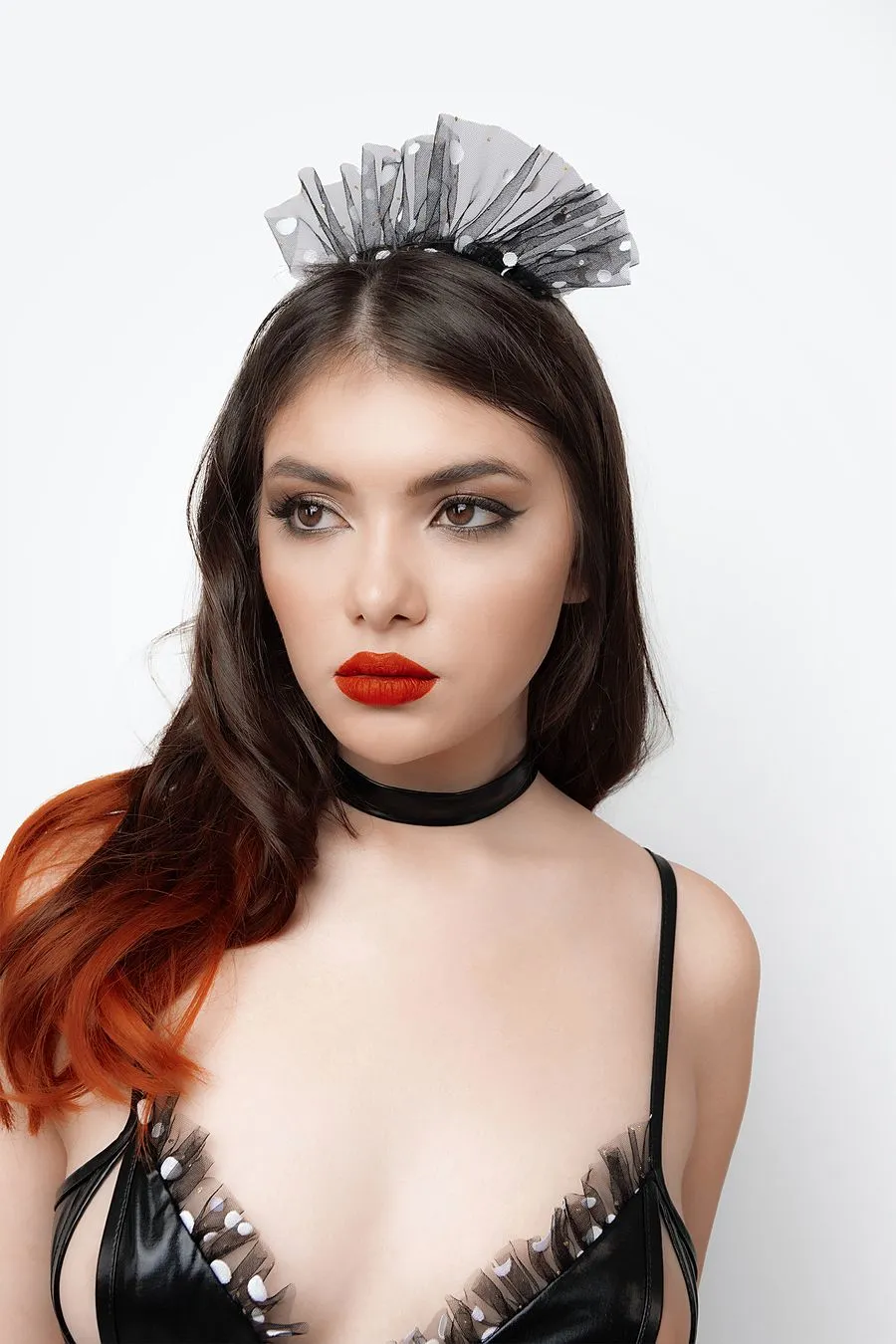 Облегающее боди подчеркивает талию и открывает ягодицы. Лиф с откровенным декольте и вырезами обнажает чувствительные зоны, а регулируемые бретели и двухрядная застежка на спине слегка поддерживают грудь. Эластичный трикотажный материал с напылением wetlook соблазнительно выглядит, приятен на ощупь, комфортен в носке. Дизайн модели скрывает животик и подчеркивает соблазнительные объемы. Минималистичный чокер на кнопке привлекает внимание к ключицам и гладкой коже. Атласный фартук с длинными завязками подчеркивает талию, притягивает внимание наблюдателя к попе и вносит элемент игры во время показа. Головной убор завершает образ.