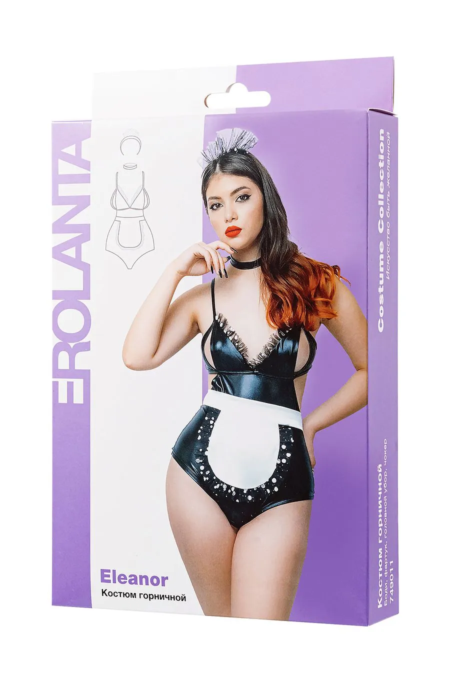 Эротический костюм горничной Erolanta® Eleanor выполнен в классической черно-белой гамме и включает в себя: боди с интимным доступом, чокер, фартук и головной убор, украшенные фривольными оборками.