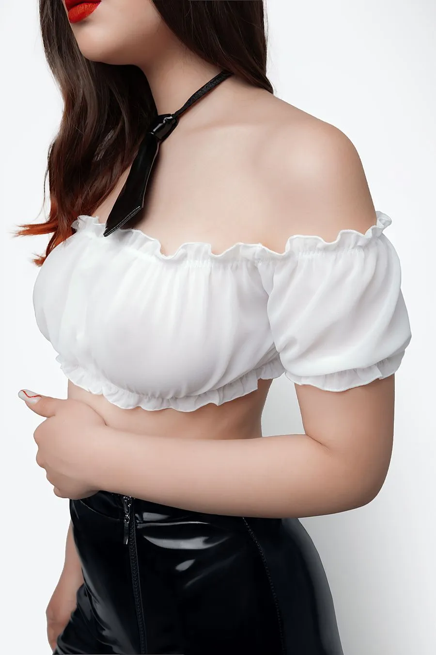 Прямая юбка из лаковой кожи скрывает животик, даёт небольшую коррекцию силуэта, подчеркивает талию и бедра. Двусторонняя молния спереди визуально удлиняет ноги и добавляет элемент игры - скинуть юбку можно в одно мгновение. Невесомый прозрачный топ из шифона придает груди соблазнительный объем, подчеркивает ключицы и декольте, не сковывает движений. Рукава-фонарики дают возможность прикрыть плечи или наоборот - добавить образу обнаженности. Галстук на эластичной резинке с небольшим крючком сзади завершает образ и придаёт кокетства.