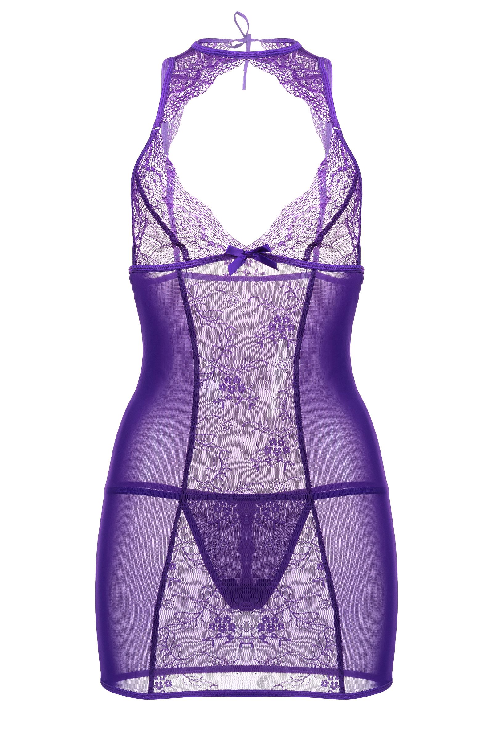 Все внимание на грудь! Кружевное фигурное декольте комбинации Candy Girl® Scarlett притягивает к себе все взгляды. Сатиновый бантик на уровне груди придает кокетства образу. Изящная кружевная спинка, регулируемые бретели и завязка на шее обеспечивают идеальную посадку лифа. Облегающий крой подчеркивает манящие изгибы силуэта. Вертикальные швы и комбинирование кружевных и сетчатых вставок визуально добавляют фигуре стройности. Эластичные ткани обеспечивают комфортное ношение. Т-стринги идеально завершают образ.