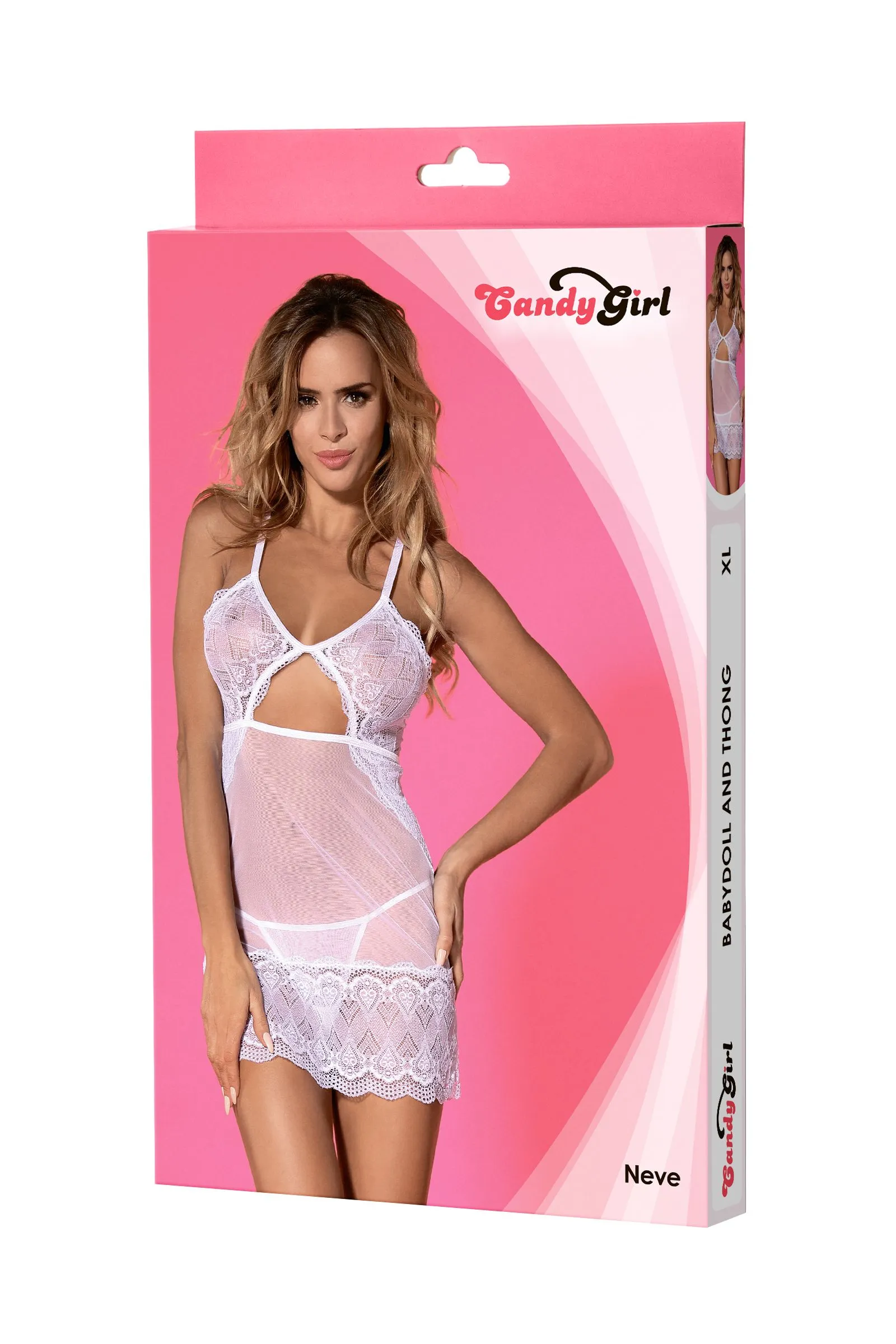 Нежная комбинация Candy Girl® Neve из эластичной сетки с кружевными вставками изящно подчеркивает грудь и бедра. Регулируемые перекрещивающиеся на спине бретели и миниатюрная шнуровка обеспечивают идеальную посадку. Подходящие стринги идеально дополняют комплект.
