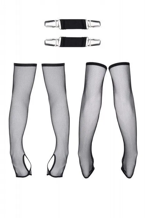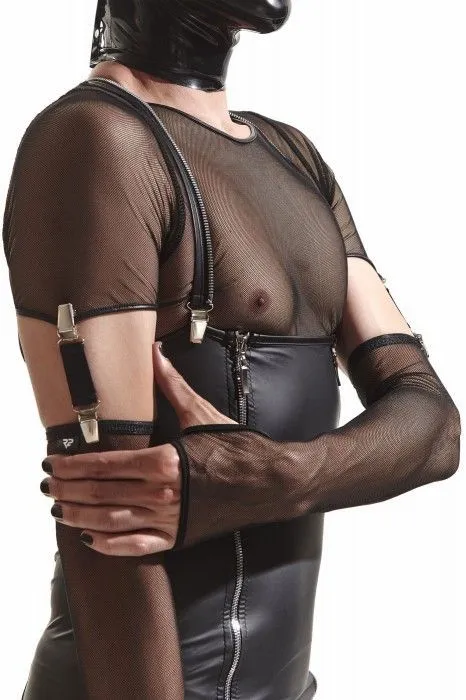 Длинные перчатки из черной эластичной сетки длиной от середины ладони до середины предплечья. Дополнительный вырез для большого пальца. Красиво облегают руки, подчёркивая рельеф. Дополнительно в комплект входят эластичные ремешки с металлическими застежками серебристого цвета. Они используются для крепления перчаток футболке, благодаря этому перчатки не скользят и смотрятся эффектно. Идеально подходит как дополнение к комплектам серии Cross-Dresser.