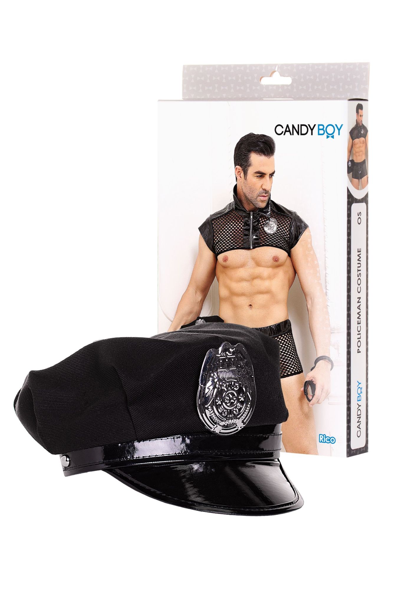 Стильный укороченный топ с отложным воротником легко расстегивается одним движением руки. Боксеры на широком эластичном поясе также дополнены провоцирующей молнией. Сочетание крупной сетки и материала wetlook выгодно подчеркивают достоинства фигуры. Пластиковые молнии без острых краев. Кепка с лаковым козырьком регулируется в обхвате. 2 значка с надписью City Police (англ. «Городская полиция») и пластиковые наручники входят в комплект.