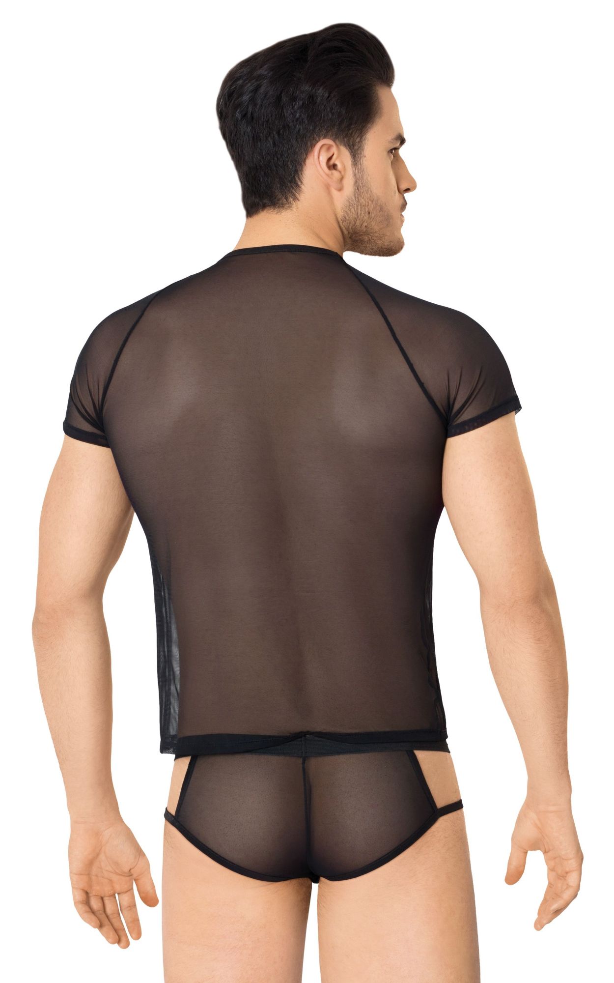 Экстравагантный комплект для смелых мужчин. Футболка и шорты выполнены из крупной эластичной сетки. Задняя часть трусов выполнена из мягкой мелкой сеточки, спереди вставка из такой же сеточки.