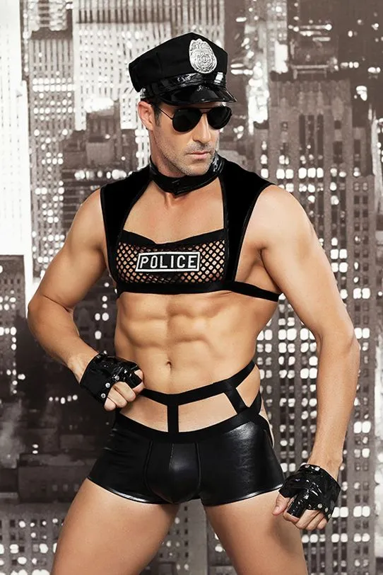 Костюм полицейского Candy Boy Davis эффектно обтянет накаченную фигуру и все выдающиеся места! Топ wetlook с надписью «Police», с воротником-стойкой на кнопке, с эластичными широкими стрепами и сеткой, подчеркнет кубики пресса и плечи. Боксеры wetlook с вырезом сзади привлекут внимание к ягодицам. Лаковые митенки на регулируемых кнопках, настоящие затемненные очки, головной убор с надписью «City Police» и пластиковые наручники идеально дополнят образ.