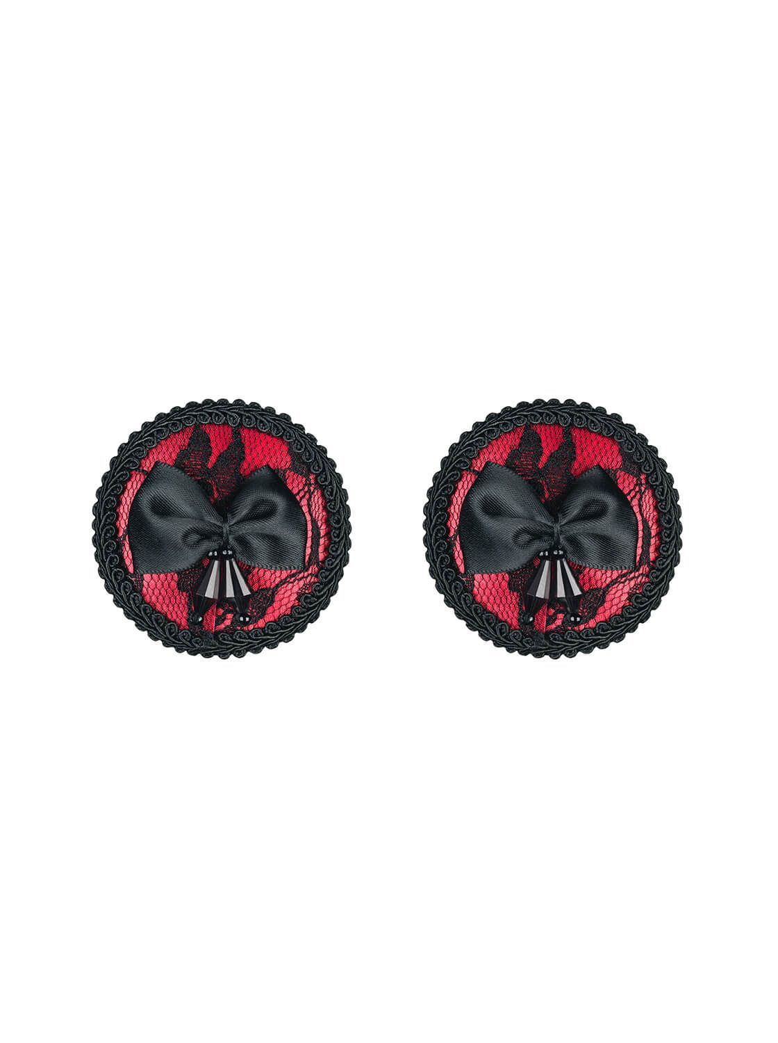Кружевные красные пестисы от бренда Obsessive, украшенные бантиком и подвеской.