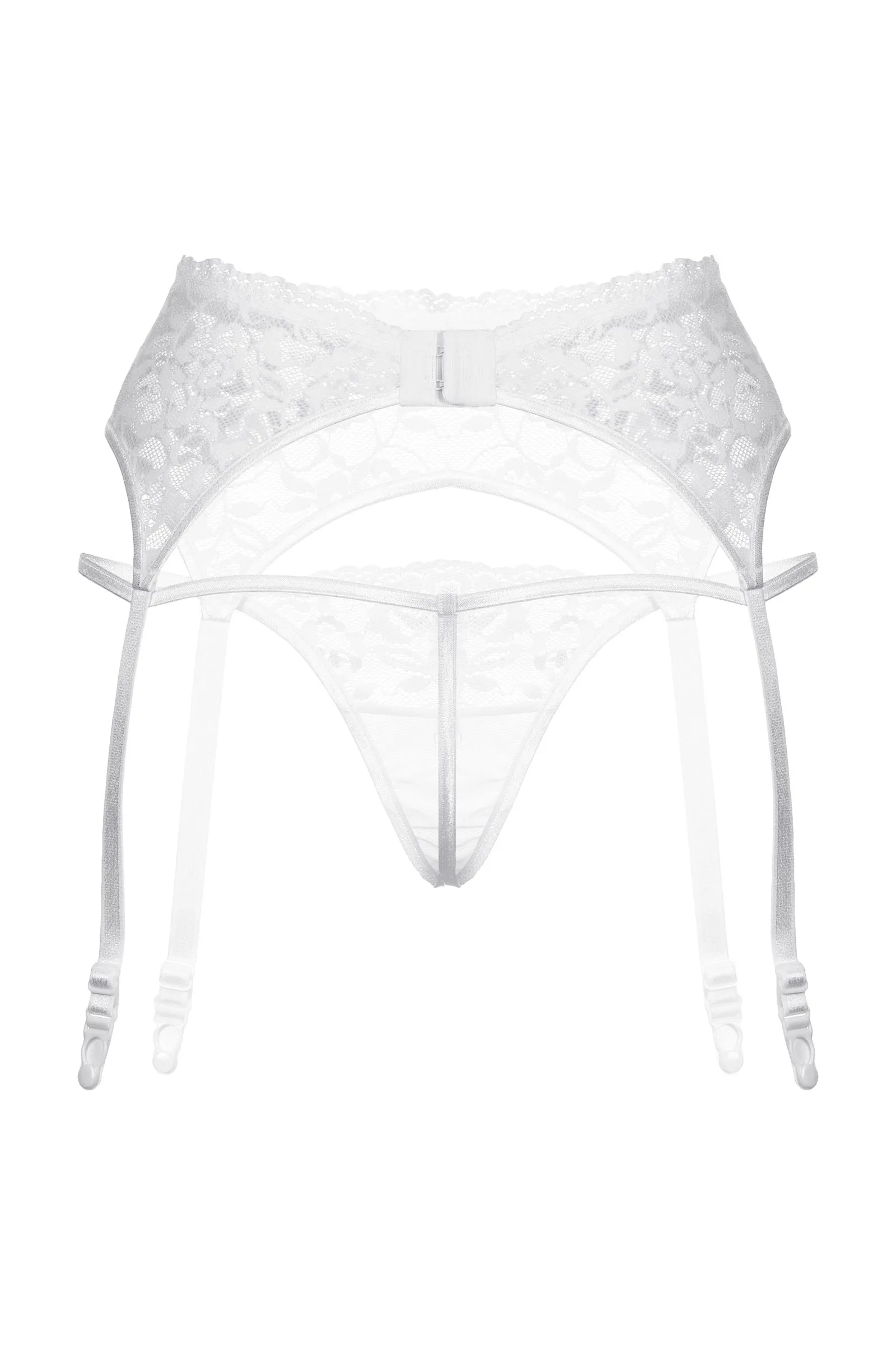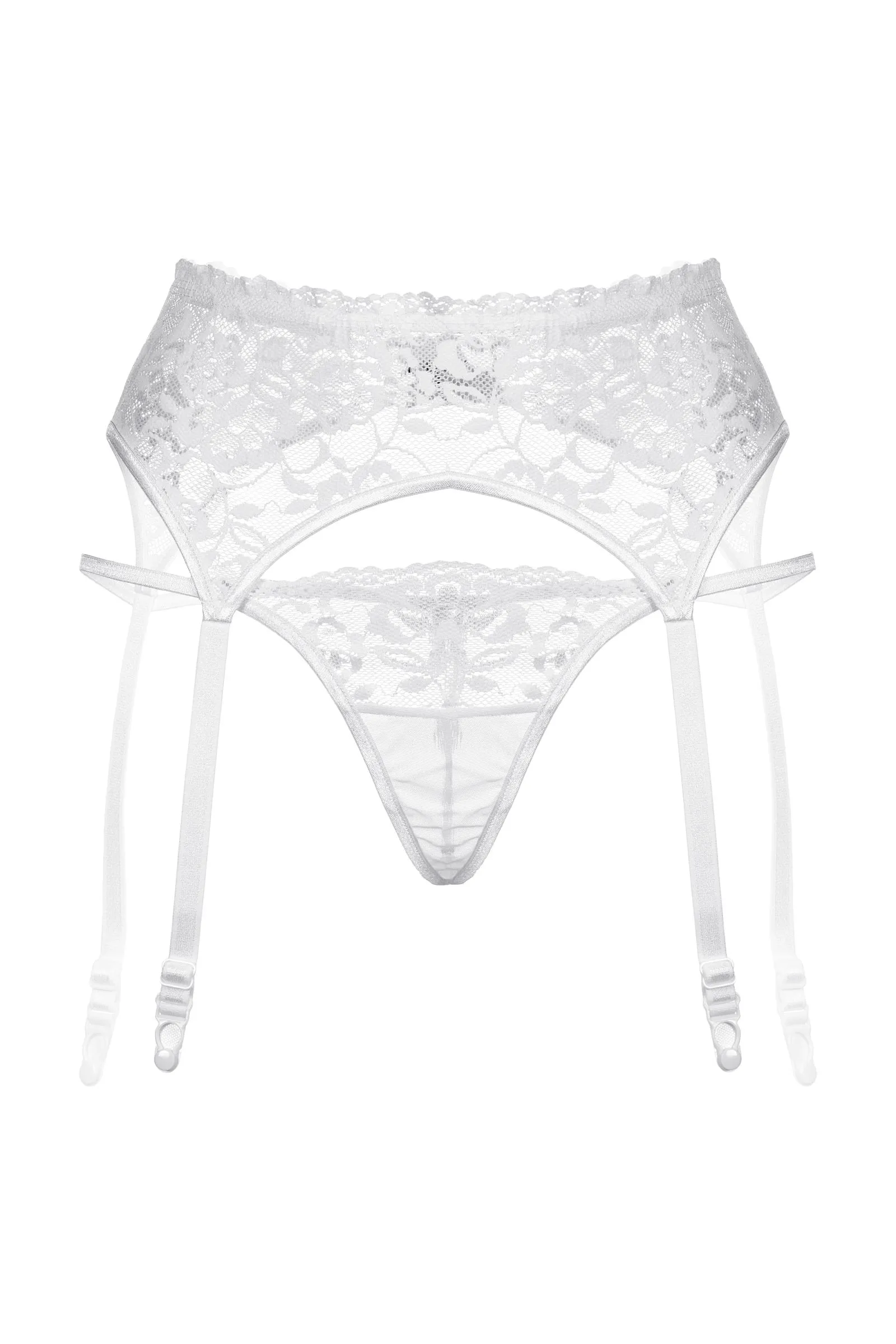 Комплект: пояс для чулок и стринги закрытые. Пояс выполнен из кружевного материала с цветочным орнаментом. Стринги из комбинированного материала: кружево (верхняя часть) и более плотная не прозрачная ткань (нижняя часть стрингов).