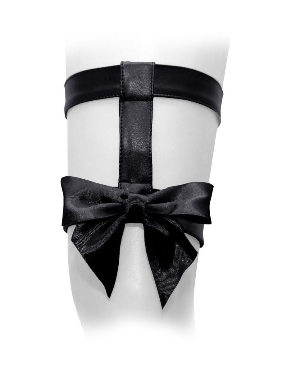 Подвязка из искусственной кожи черного цвета - это сексуальный аксессуар, который дополнит комплект нижнего белья и придаст образу пикантности. Подвязка украшена милым бантиком и двойным ремешком, которые будут отлично смотреться на Вашей ножке. Этот аксессуар можно носить как самостоятельно, так и вместе с чулками для создания более проработанного образа. Наденьте эту соблазнительную деталь на романтический вечер с Вашим возлюбленным, чтобы вызвать его восхищение и страсть от лицезрения Ваших ножек, украшенных пикантной подвязкой.
