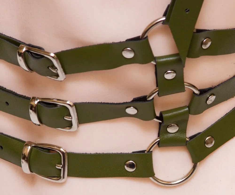 Портупея с 3 ремнями подойдет для повседневного ношения поверх одежды, а также для создания необходимого образа во время ролевых игр. Портупея выполнена из натуральной кожи зеленого цвета, спереди и сзади ее украшают 3 ремня с пряжками. Надев данный аксессуар, Вы сможете подчеркнуть свой дерзкий стиль и раскрыть всю страстность своей натуры.