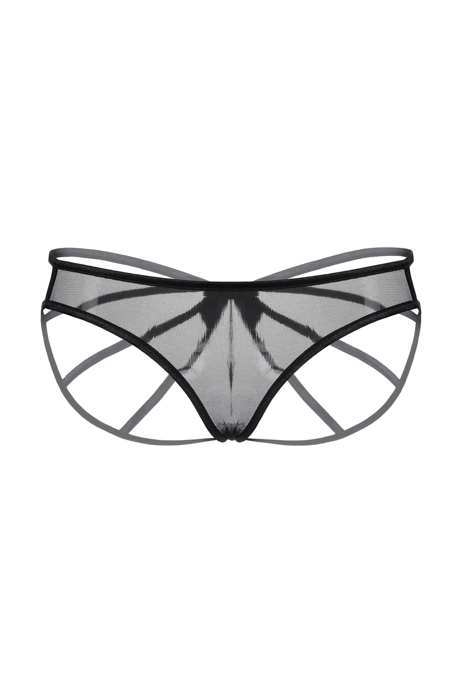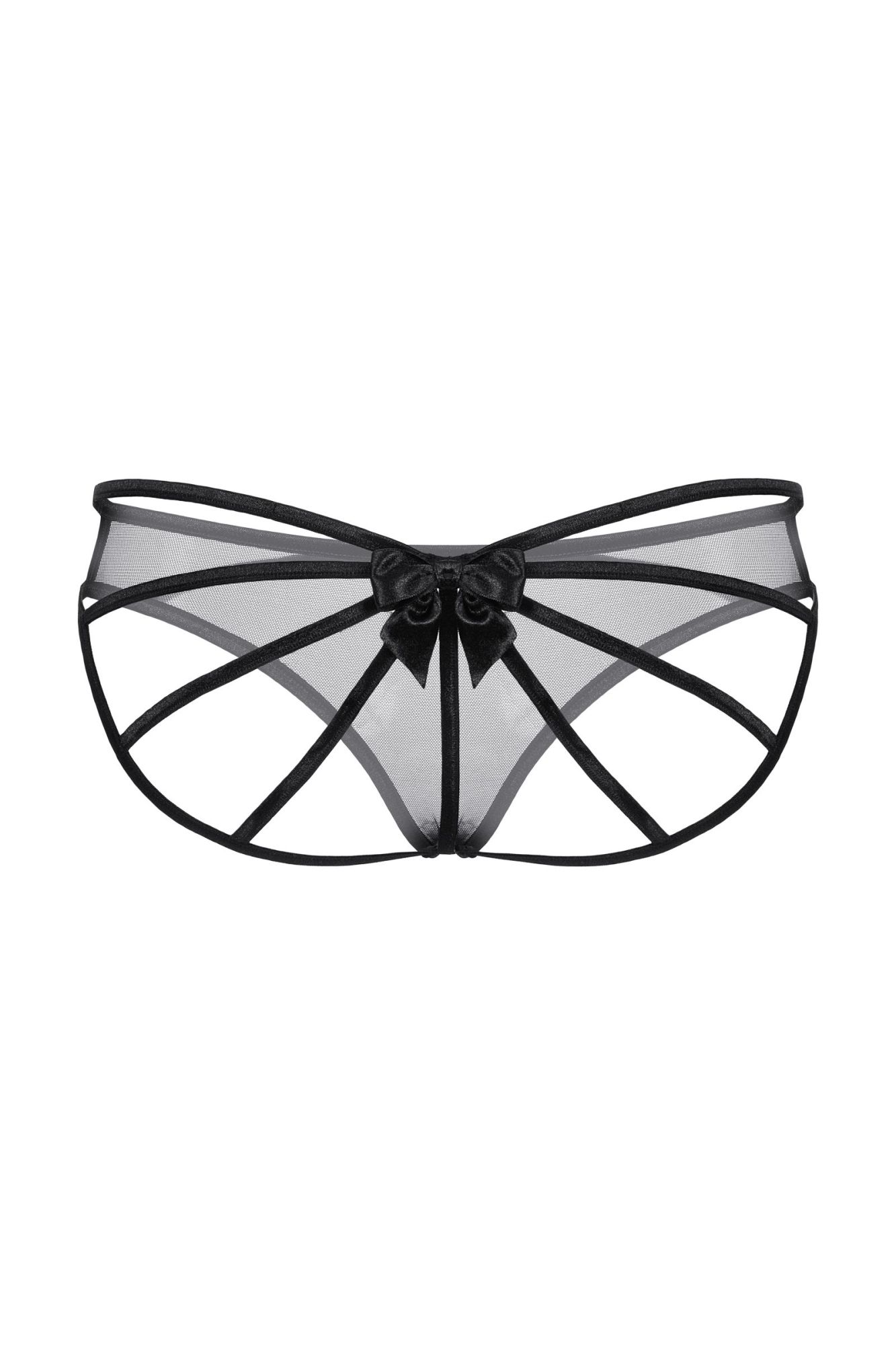 Оригинальные трусики для создания необычного образа. Спереди прозрачная мягкая сеточка, но сзади трусики выполнены оригинальным образом. Переплетение тесьмы увенчано роскошным атласным бантом.