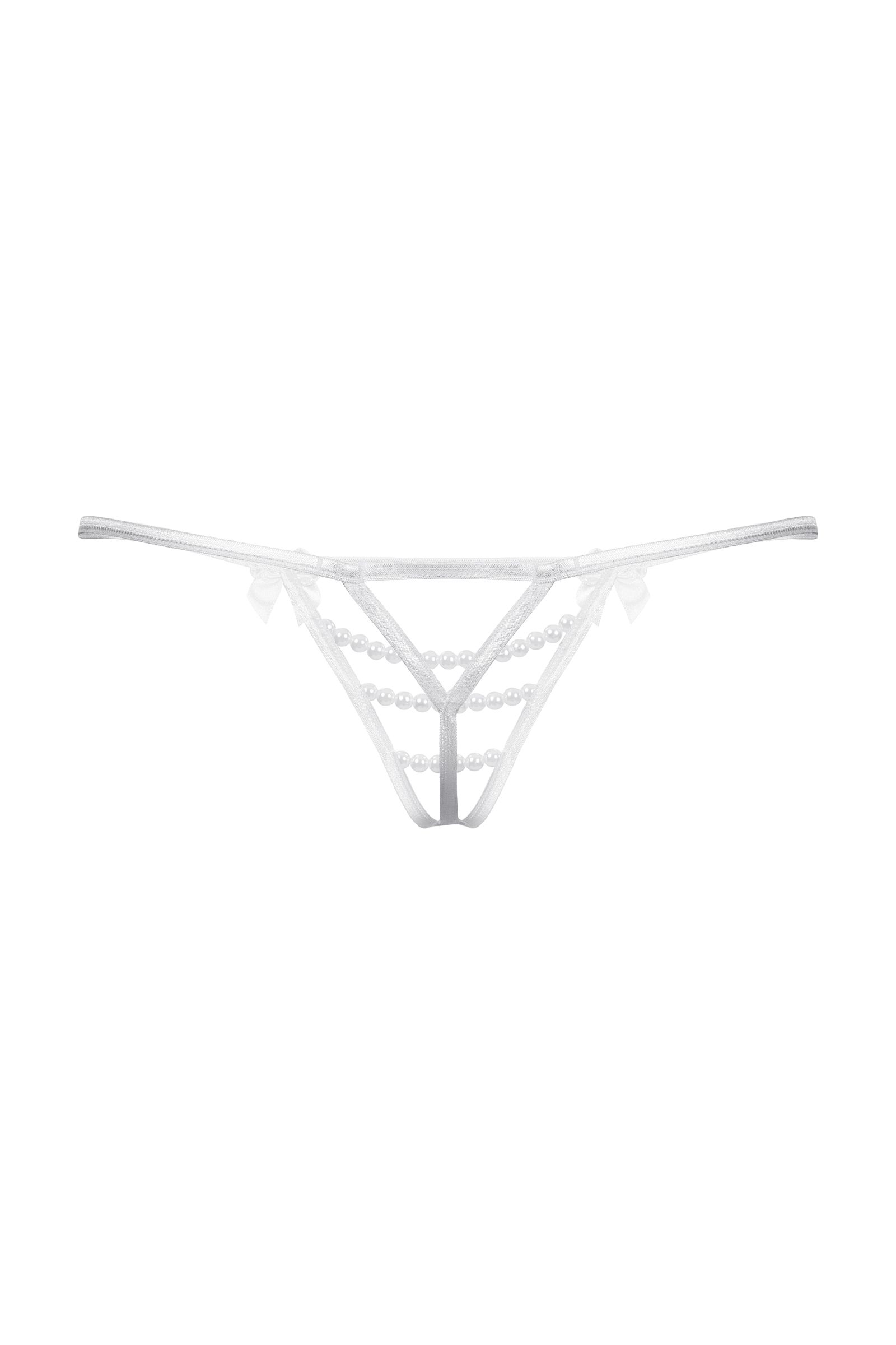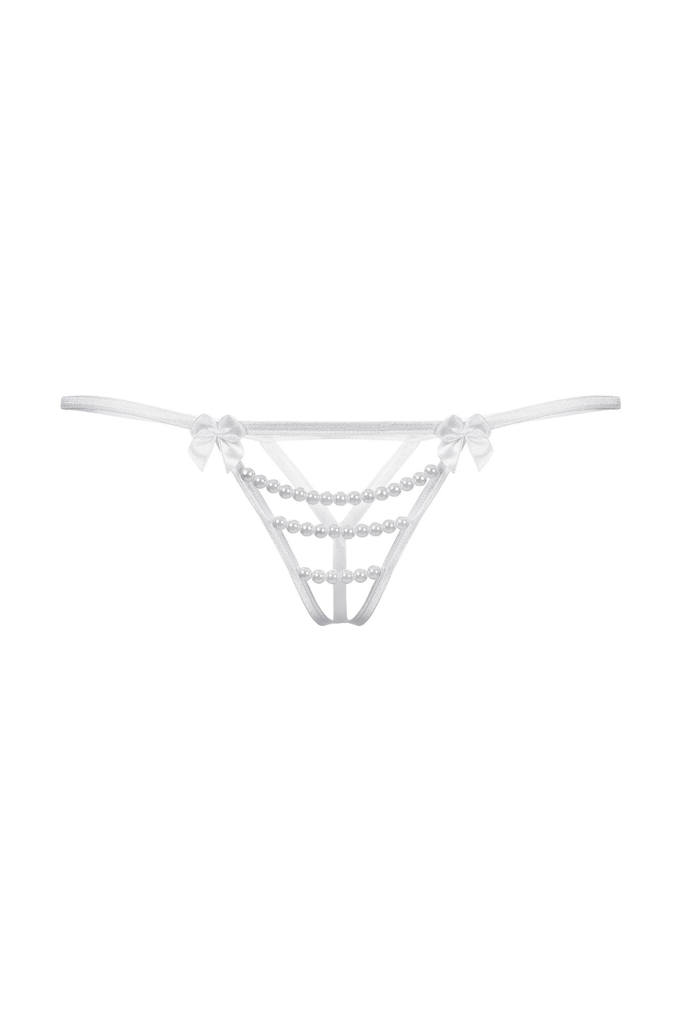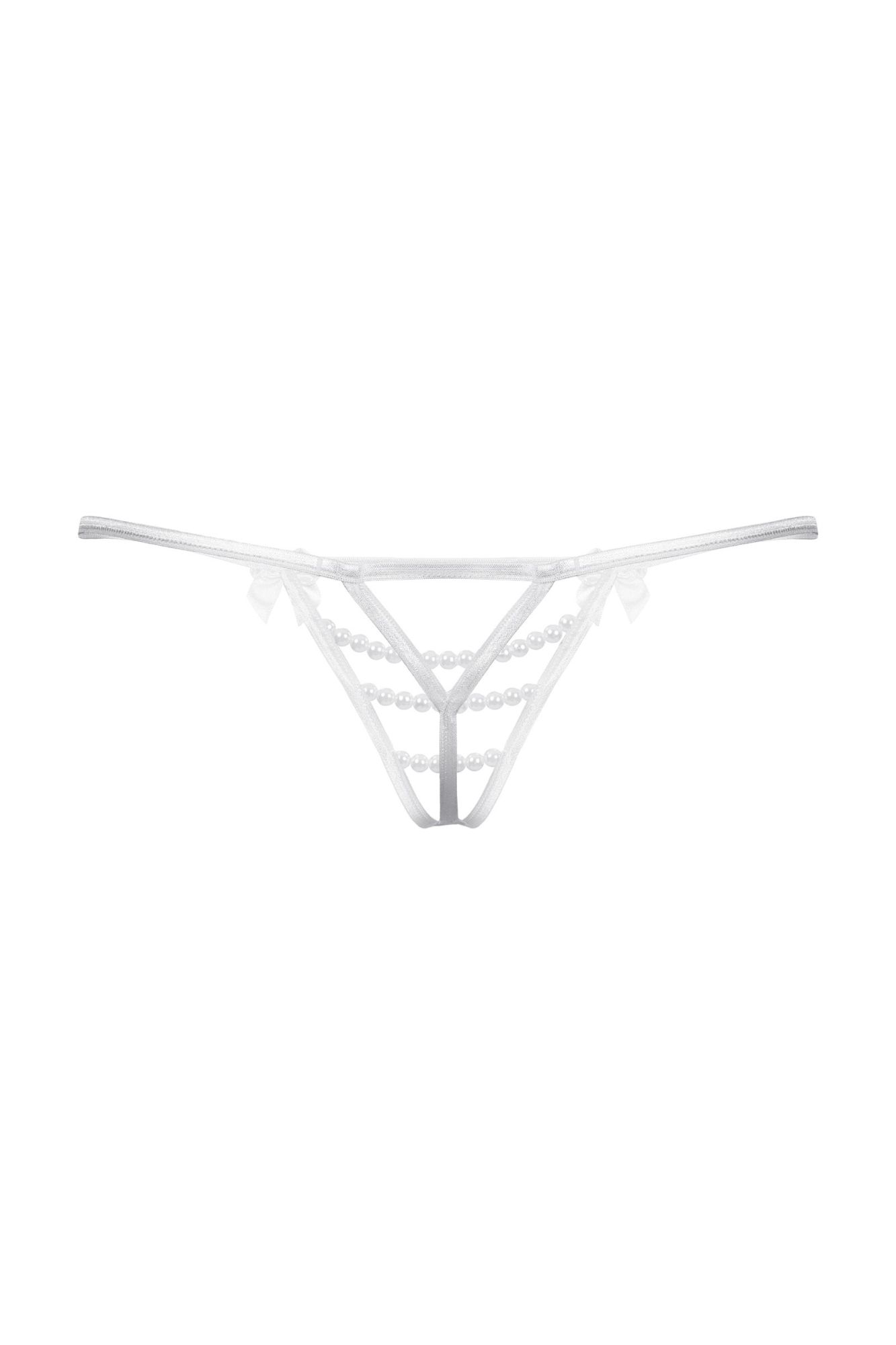 Стринги с открытым доступом. Спереди декорированы двумя кокетливыми бантиками и тремя горизонтальными нитями "жемчуга".