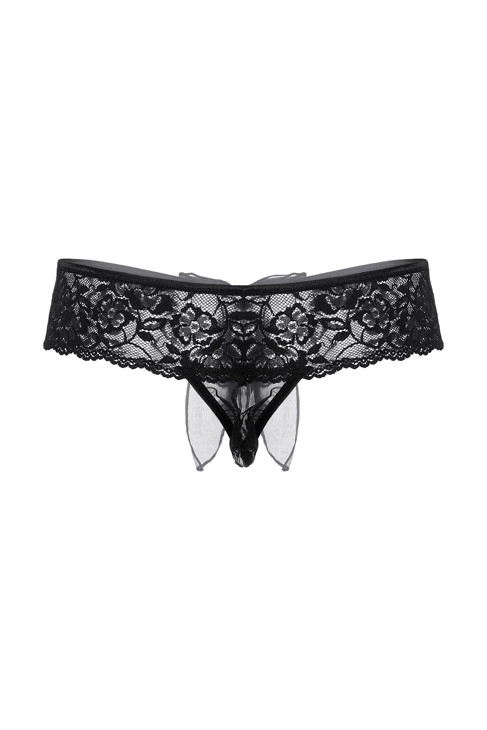 Шикарные кружевные трусики с открытым доступом. Роскошное кружево облегает соблазнительные изгибы бедер и ягодиц. Два маленьких бантика с крошечными бусинами притягивают взгляд. Интригующий бант из тюля, как вишенка на торте, завершает сексуальный образ.