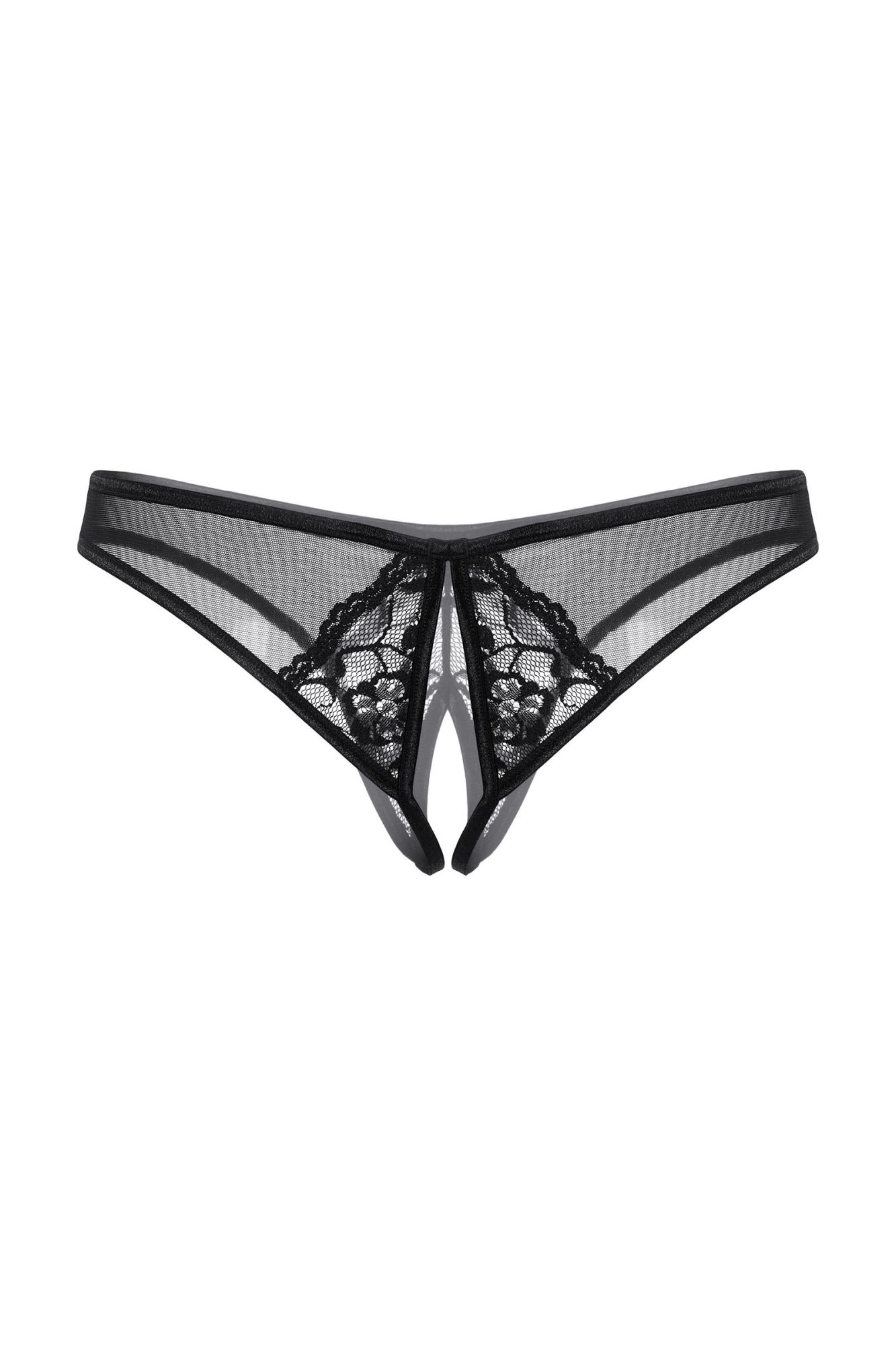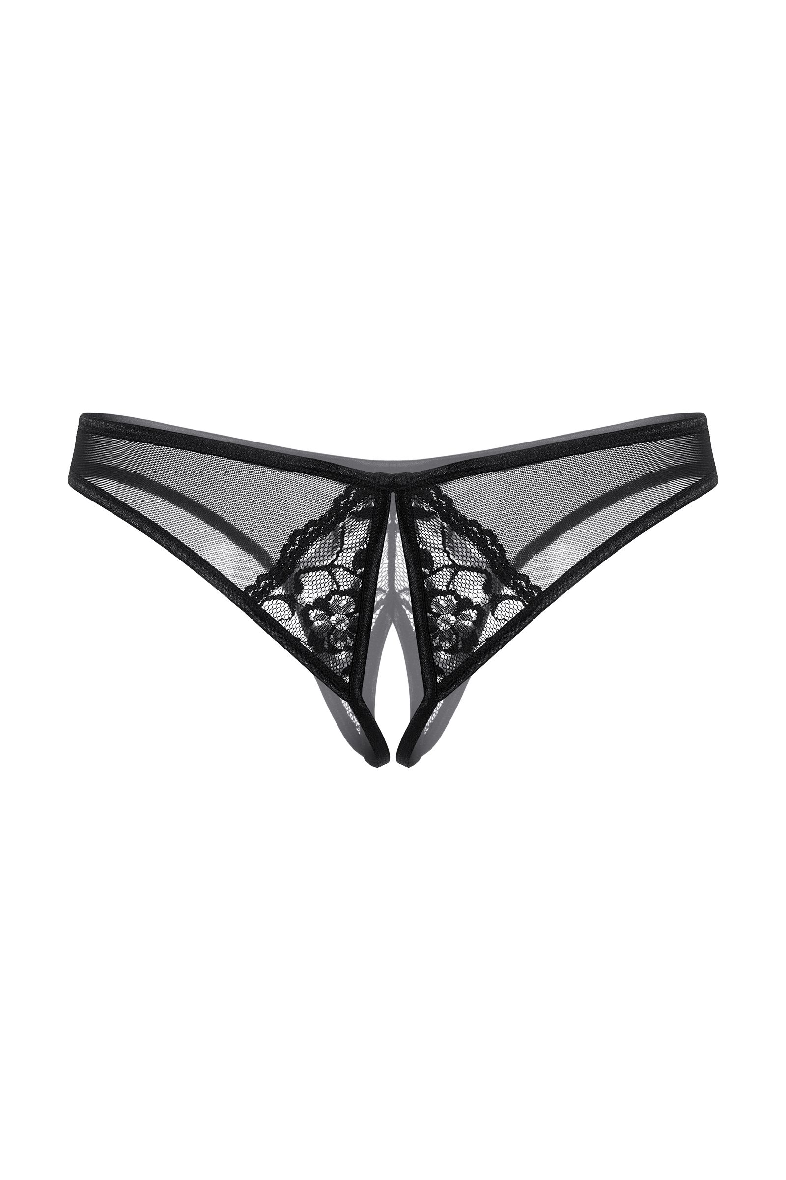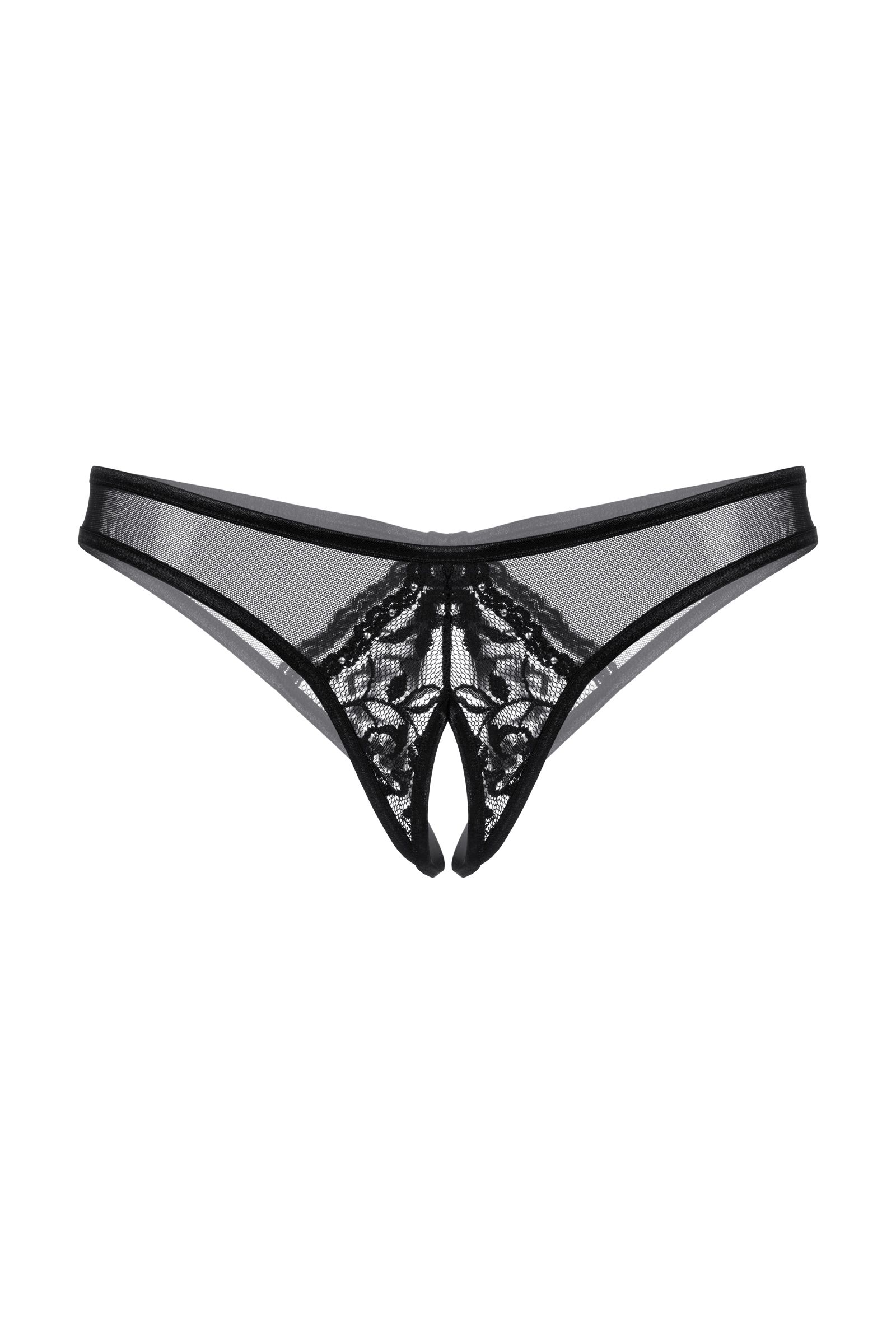 Трусы с доступом, выполненные из тонкой сетки в сочетании с кружевом, декорированы стразами.