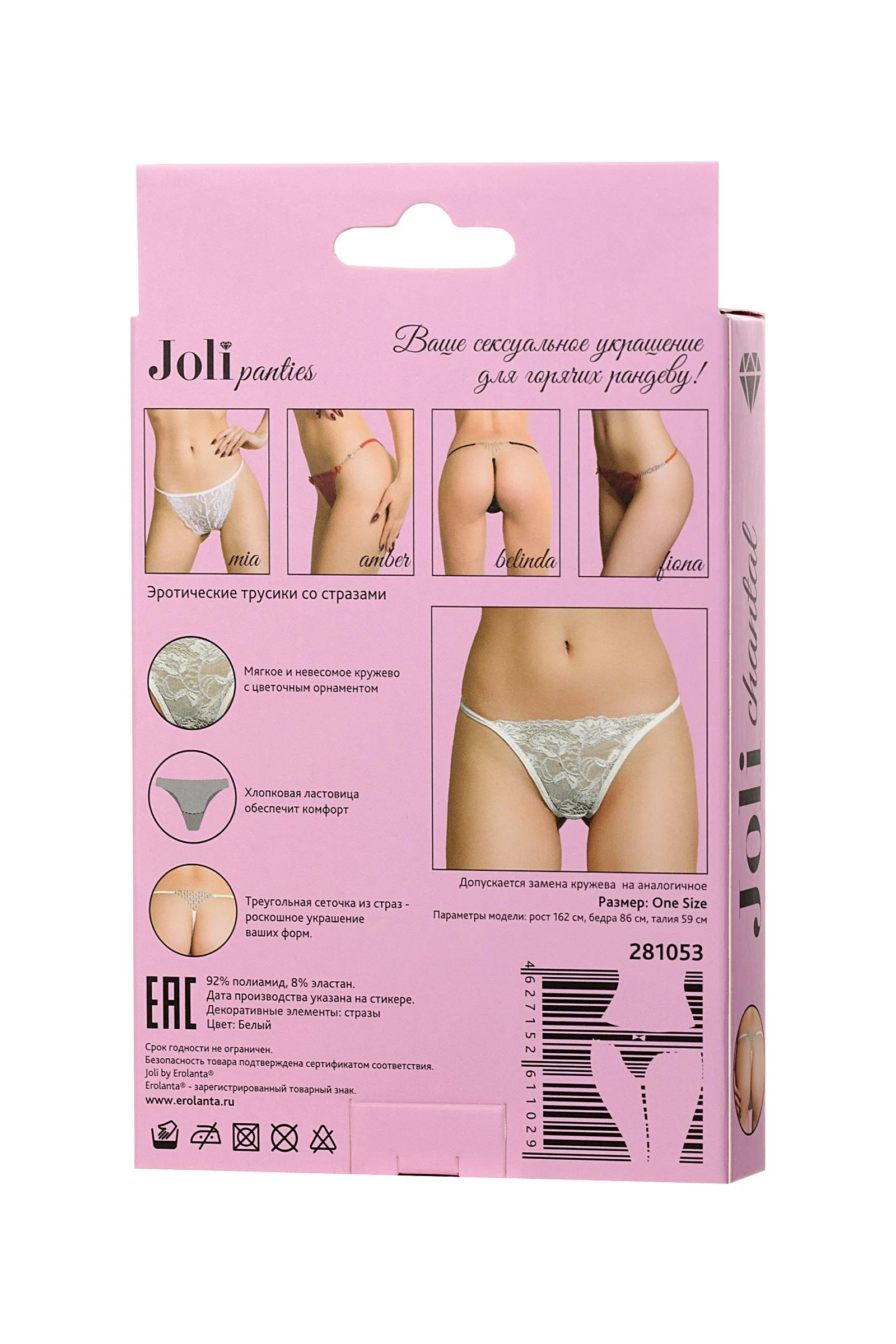 Joli panties – ваше сексуальное украшение для горячих рандеву! Новая линейка романтичного белья Joli (в пер. с французского красивая) радует глаз элегантными деталями и нежными материалами европейского качества. Полупрозрачное цветочное кружево впереди подчеркнет эротический настрой. Тонкие, мягкие лямочки и хлопковая ластовица обеспечат комфортные ощущения. Главный сюрприз - треугольная сеточка из страз на попе.Оригинальное колье, которое подчеркивает формы ваших ягодиц. Joli panties – выбери украшение для обольщения!