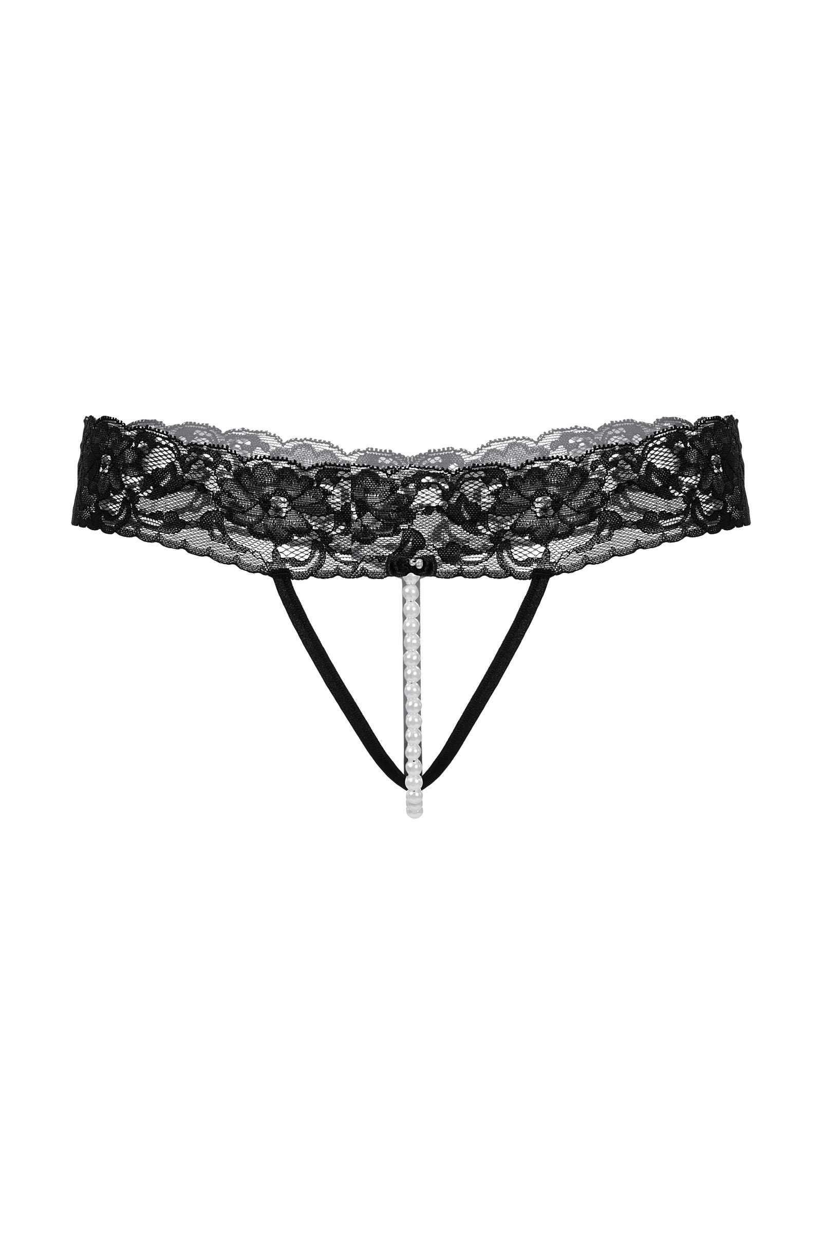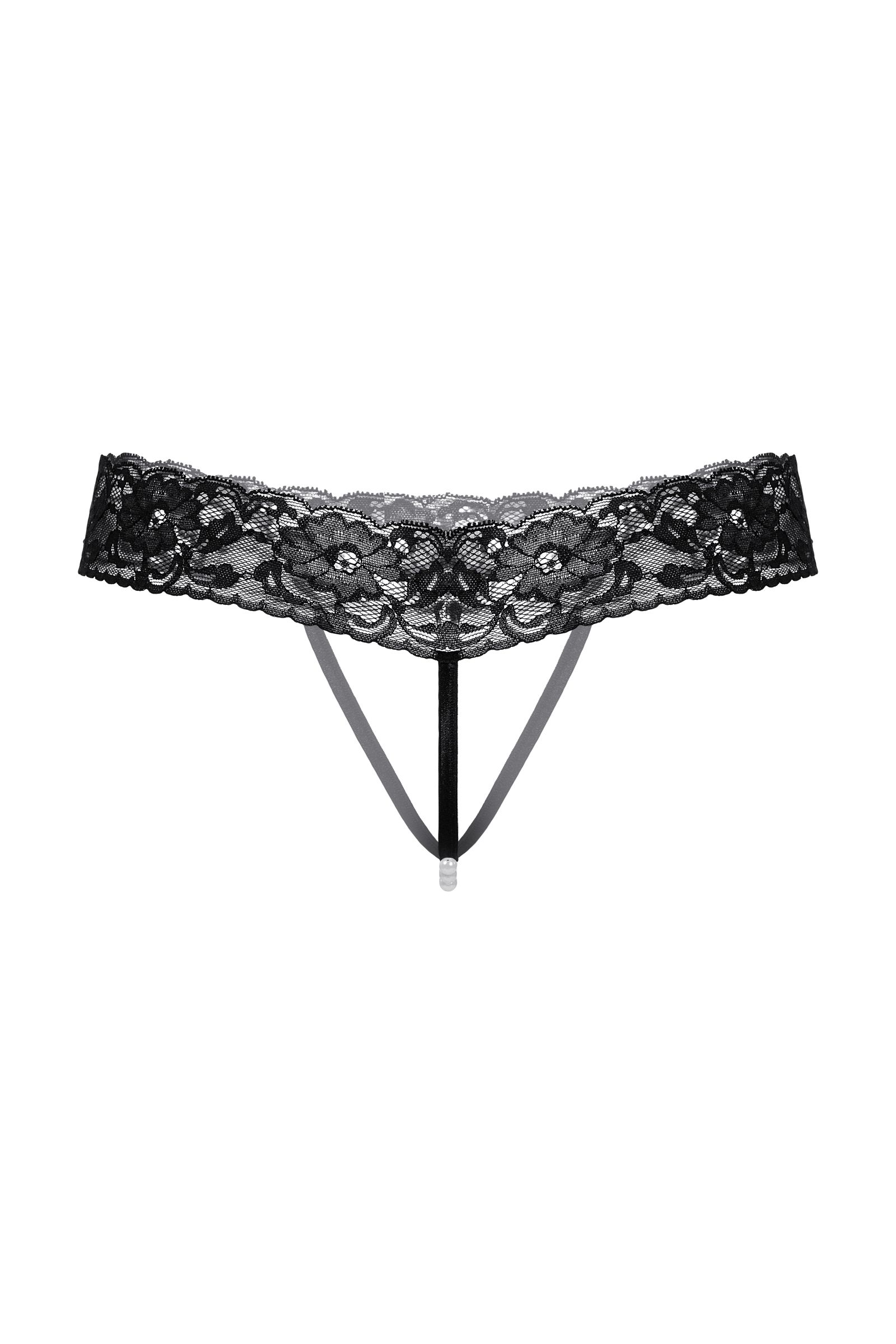 Кружевные стринги с открытым доступом. Спереди декорированы кокетливым бантиком и нитью "жемчуга". Оригинальная кружевная резинка подчеркивает линию бедер.