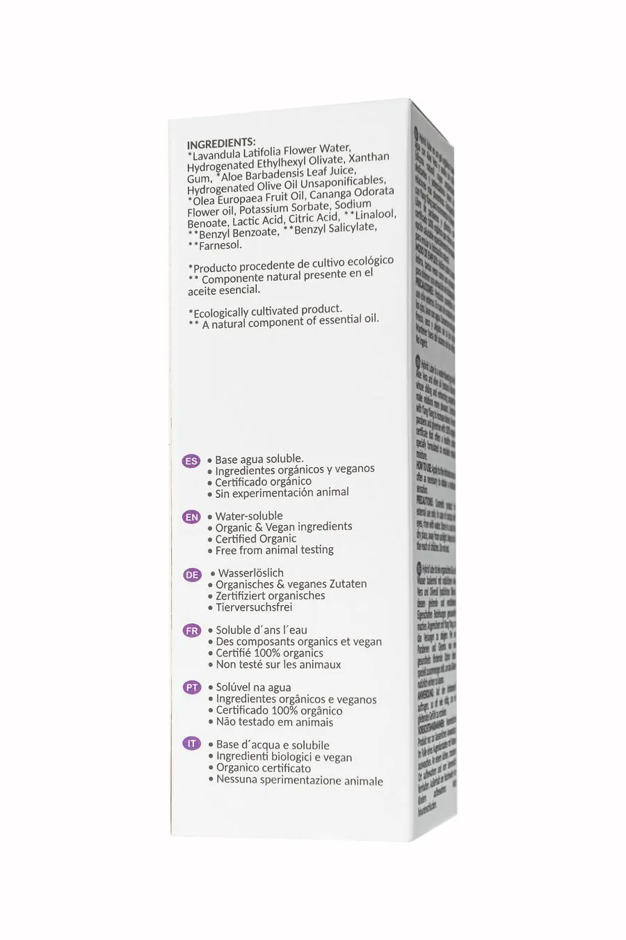 Цветочная вода лаванды широколистной, гидрогенизированный этилгексиловый оливат, ксантановая камедь, сок листьев алоэ барбаденсиса, гидрогенизированное неомыляемое оливковое масло, фруктовое масло Olea Europaea, цветочное масло Cananga Odorata, сорбат калия, бензоат натрия, молочная кислота, лимонная кислота, линалоол, бензилбензоат, бензилсалицилат, фарнезол