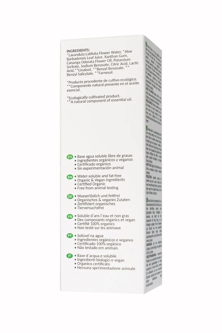 цветочная вода лаванды широколистной, сок листьев алоэ барбаденсис*, ксантановая камедь, цветочное масло кананги душистой, сорбат калия, бензоат натрия, лимонная кислота, молочная кислота, линалоол, бензилбензоат*, бензилсалицилат, фарнезол**