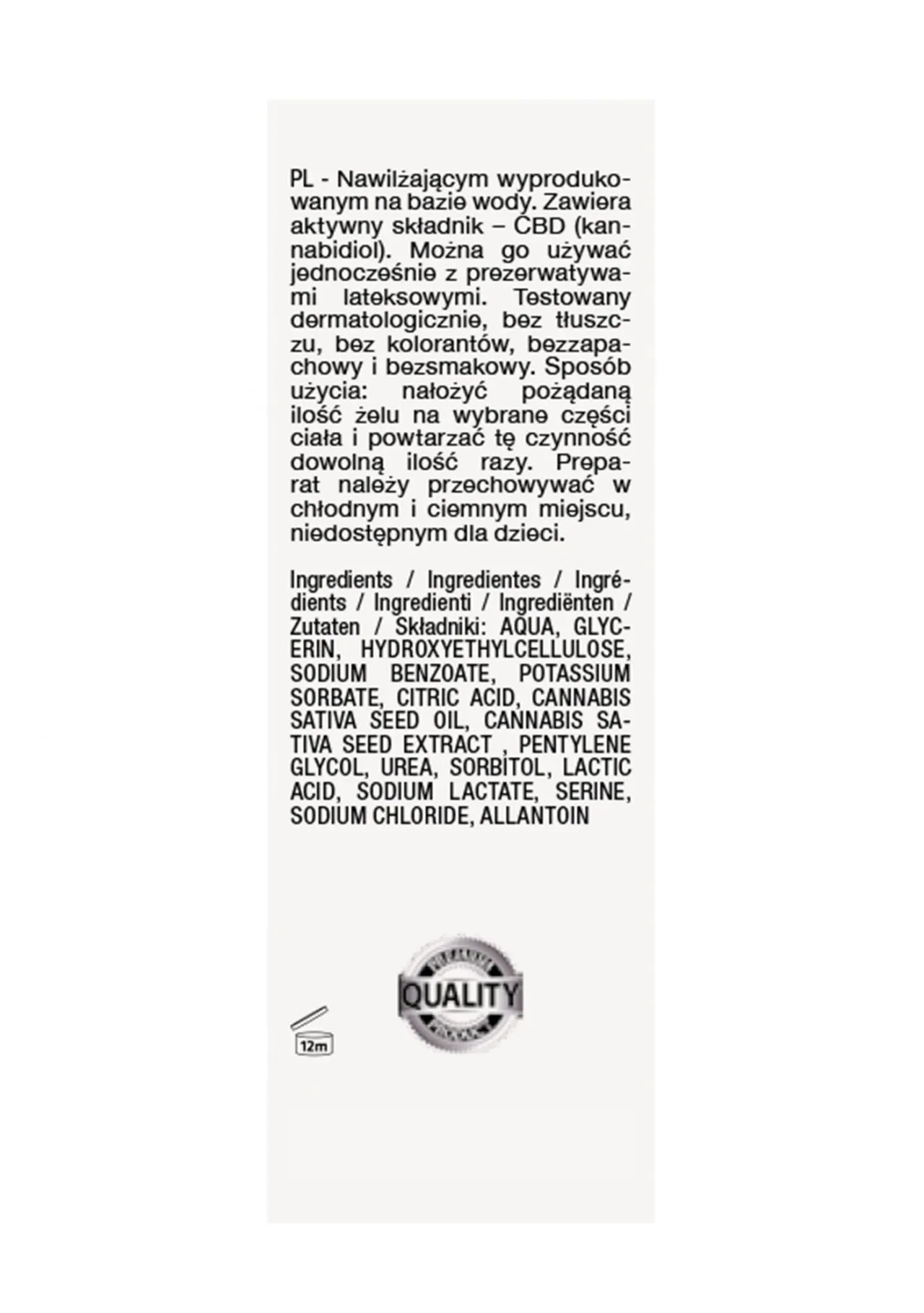 Состав: Вода, глицерин, Гидроксиэтилцеллюлоза, бензоат натрия, Сорбат калия, Лимонная кислота, Пентилен Гликоль, Масло семян конопли сативы, сорбит, мочевина, лактат натрия, молочная кислота Кислота, серин, семена конопли сативной Экстракт, хлорид натрия, Аллантоин.