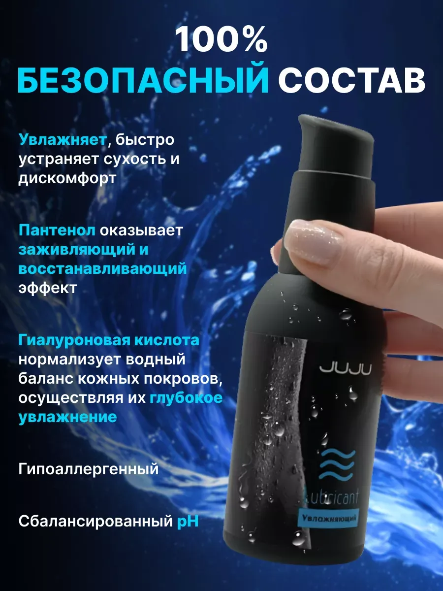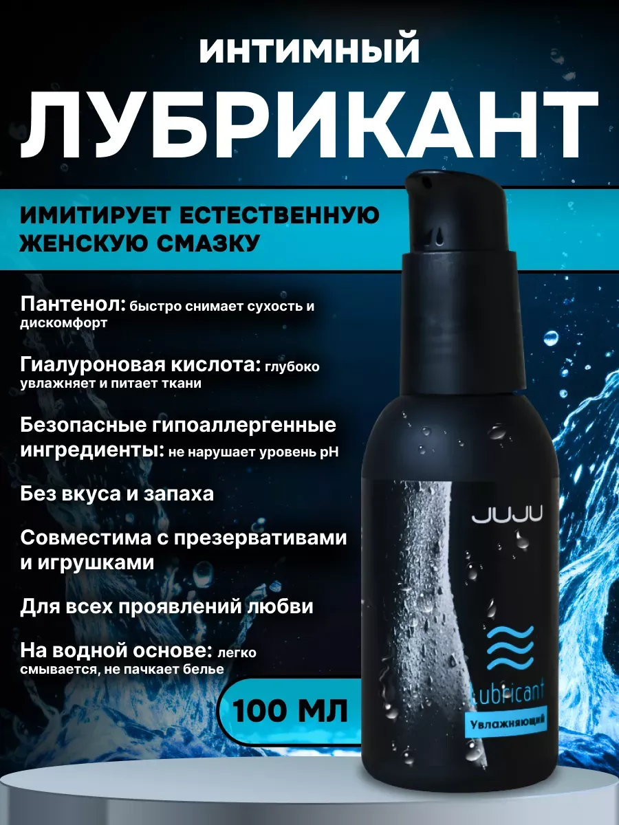 Приятное и нежное увлажнение осуществляет лубрикант JUJU увлажняющий. Входящий в состав лубриканта гиалуронат натрия оказывает глубокий увлажняющий эффект, пантенол заживляет и устраняет любые болезненные ощущения. Средство подходит для применения с презервативом и легко смывается с тела. Подходит для чувствительной кожи и помогает справиться с вагинальной сухостью. Состав: вода очищенная, глицерин, ПЭГ-400, метилпарабен,этилпарабен в пропиленгликоле, гидроксиэтилцеллюлоза, пантенол, гиалуронат натрия, сополимер акрилатов, триэтаноламин, ЭДТА  срок годности-3 года.
