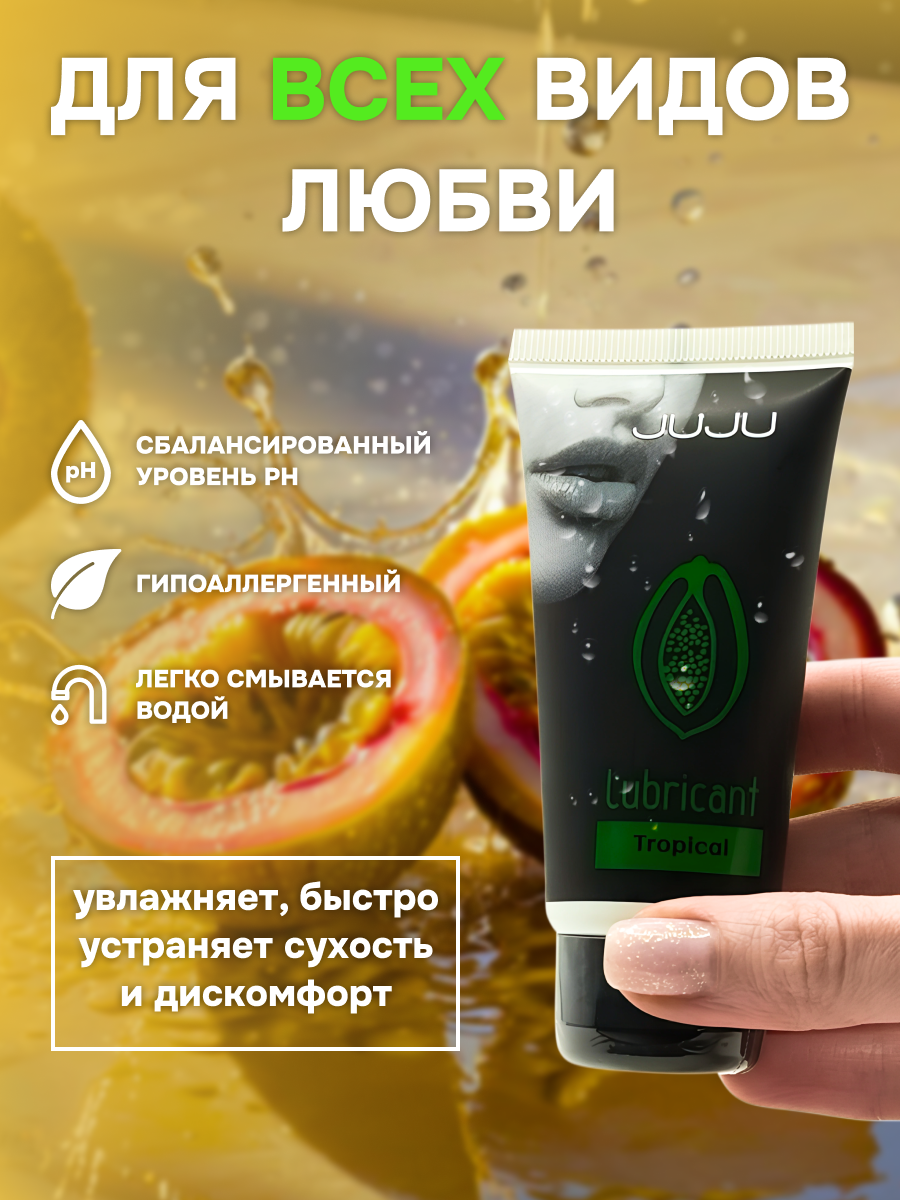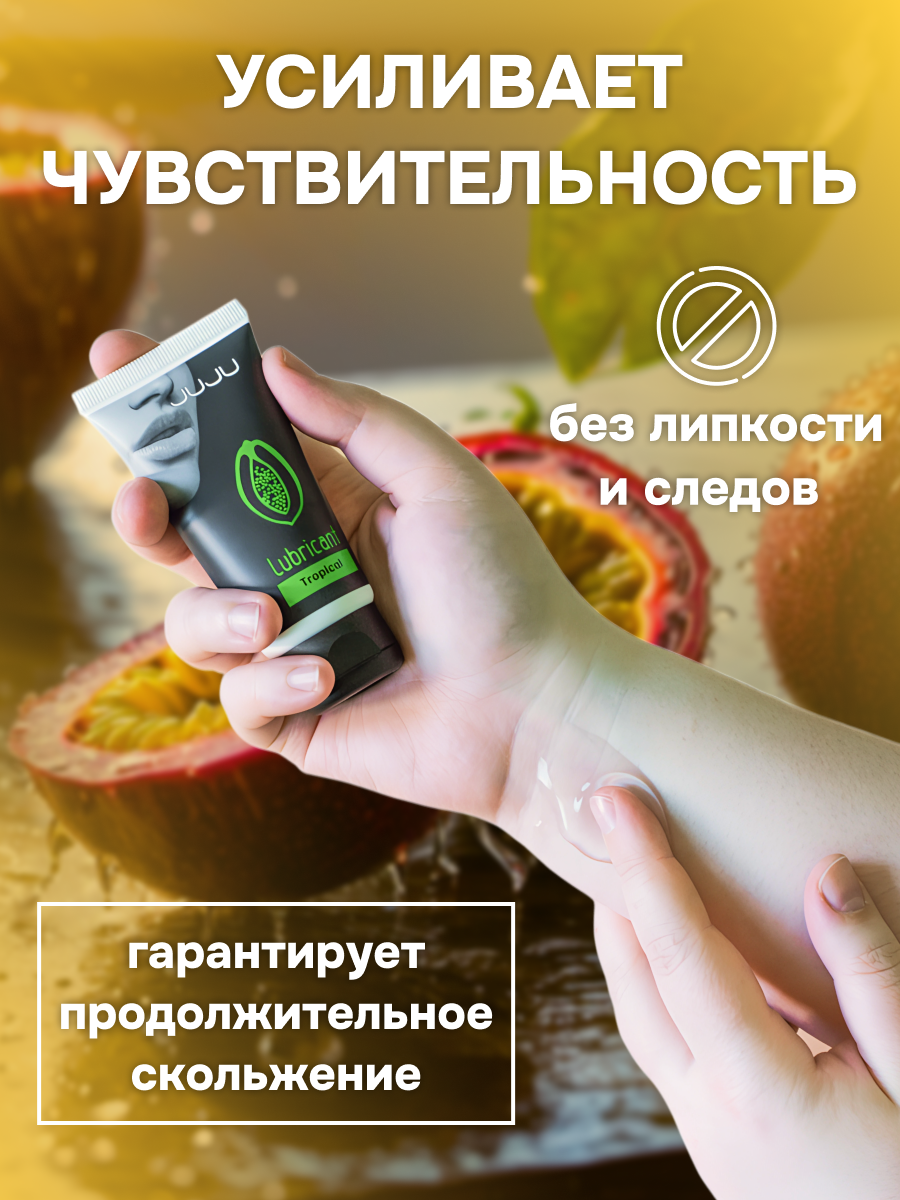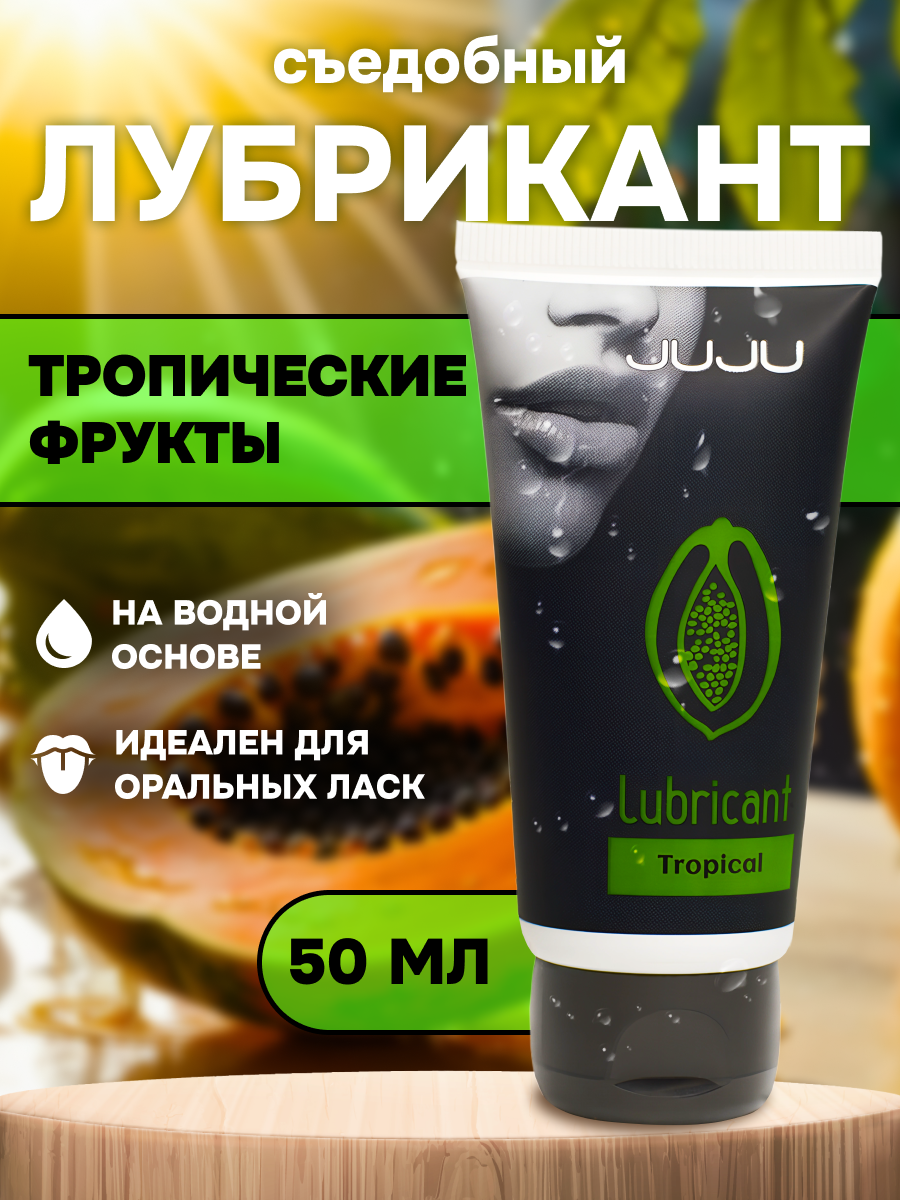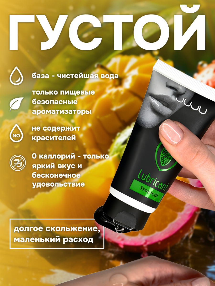 Съедобный лубрикант со вкусом тропических фруктов отлично подойдет для любого вида близости. Водная основа смазки позволяет разнообразить интимную жизнь, обеспечивая продолжительное шелковистое скольжение. Лубрикант можно использовать с любыми интим игрушками, а также с презервативами. Состав: вода очищенная, глицерин, гидроксиэтилцеллюлоза, бензоат натрия, сорбат калия, пропиленгликоль, ароматизатор пищевой, сахаринат натрия, лимонная кислота, объем – 50 мл, производитель – JuJu (Россия). срок годности-3 года.