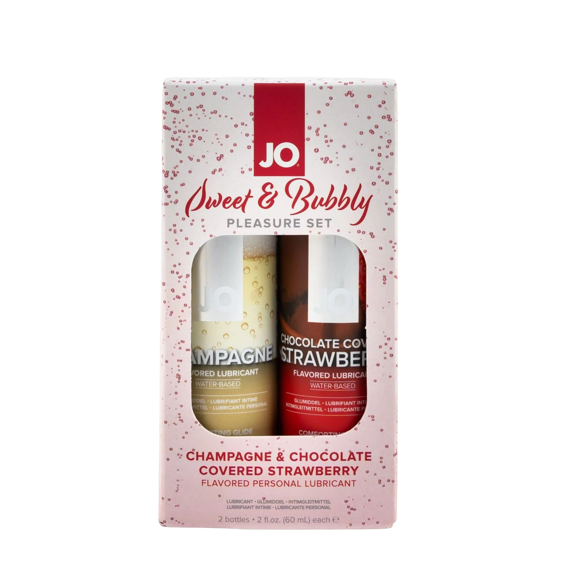 Набор из лубрикантов "JO": Шампанское/Champagne и Клубника в шоколаде/Chocolate Covered Strawberry станет прекрасным дополнением к романтическому вечеру. Благодоря вкусовым лубрикантам оральные ласки становятся более приятными и страсными.