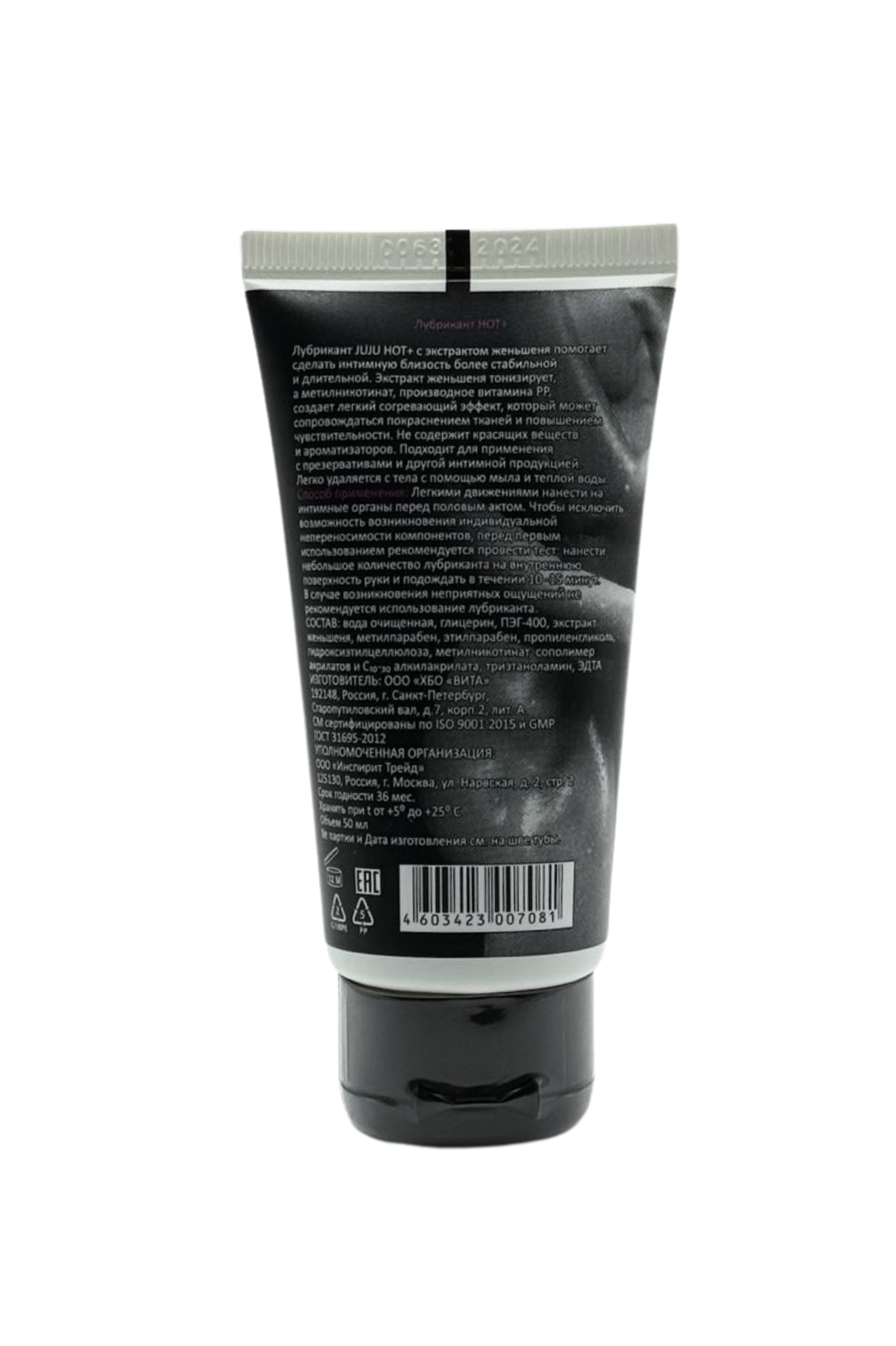 Лубрикант JUJU HOT+ с экстрактом женьшеня обладает возбуждающим эффектом. Экстракт женьшеня тонизирует, а метилникотинат, производное витамина РР, улучшает микроциркуляцию и создает легкий согревающий эффект, который может сопровождаться покраснением тканей и повышением чувствительности. Не содержит красящих веществ и ароматизаторов. Лубрикант совместим с презервативом и другой интимной продукцией. Легко смывается мыльной водой. Состав: вода очищенная, глицерин, ПЭГ-400, экстракт женьшеня, метилпарабен,этилпарабен в пропиленгликоле, гидроксиэтилцеллюлоза, метилникотинат, сополимер акрилатов, ЭДТА.  Срок годности- 3 года.
