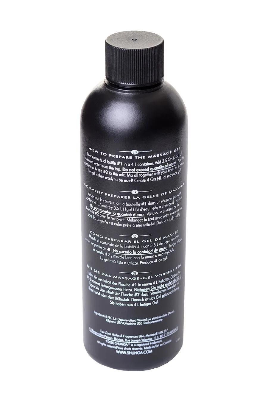 • Приготовление геля: Налейте 3,5 литра теплой воды и содержимое бутылочки №1 в любую емкость. Добавьте бутылочку №2 и хорошо перемешайте. Вы получите 4 литра массажного геля.