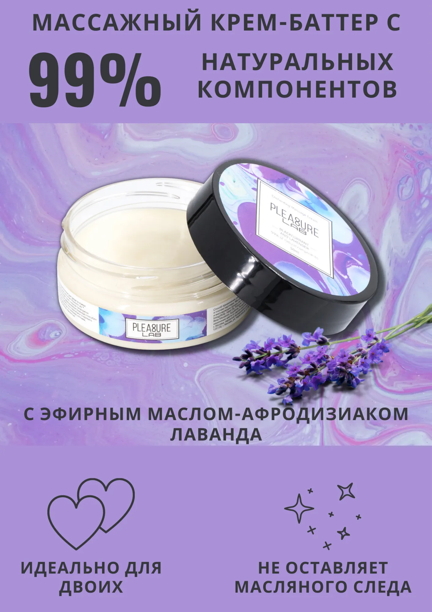 Pleasure Lab Enchanting с ароматом черной смородины и эфирным маслом-афродизиаком лаванда способен полностью расслабить тело партнера и очаровать изысканным ароматом со свежими нотками, одаривая небывалой нежностью. Способ применения: разотрите небольшое количество крема в ладонях и медленно начните продвигаться массирующими движениями от ступней к спине и плечам партнера. Массажный крем подходит для самомассажа, а также выравнивает и увлажняет рельеф кожного покрова за счет специальных активных ингредиентов и массирующих гранул, не оставляя маслянистой пленки.  Состав: масло ши (карите), масло кокосовое, масло оливковое, масло макадамии, масло зародышей пшеницы, парфюмерная композиция, эфирное масло лаванды, СК-СО2 экстракты (розмарин, плоды черной смородины), натуральный антиоксидант (токоферол (смесь), бета-ситостерол, сквален), витамин Е. Срок годности- 2 года.