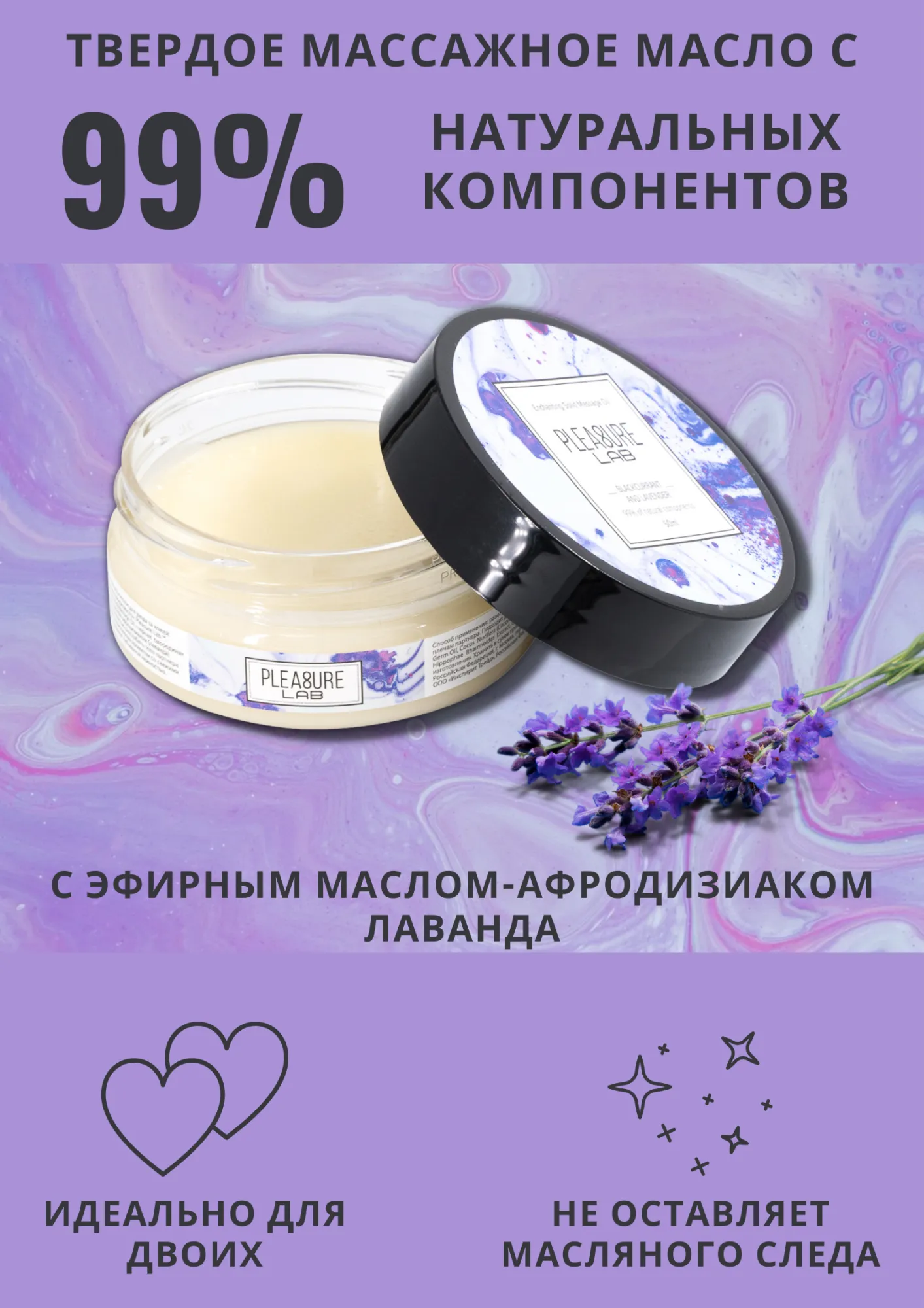 Pleasure Lab Enchanting с ароматом черной смородины и эфирным маслом-афродизиаком лаванда способно полностью расслабить тело партнера и очаровать изысканным ароматом со свежими нотками, одаривая небывалой нежностью. Способ применения: разотрите небольшое количество масла в ладонях и медленно начните продвигаться массирующими движениями от ступней к спине и плечам партнера. Подходит для самомассажа. Состав: масло ши (карите), миндальное масло, масло зародышей пшеницы, масло кокосовое, воск рисовых отрубей, парфюмерная композиция, эфирное масло лаванды, СК-СО2 экстракты (розмарин, лимон, облепиха, календула), натуральный антиоксидант (токоферол (смесь), бета-ситостерол, сквален), витамин Е. Срок годности- 2 года.
